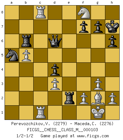 Last move : 1/2-1/2 2022 July 30 23:20:54 [Event "FICGS__CHESS__CLASS_M__000103"] [Site "FICGS"] [Date "2022.07.04"] [Round "1"] [White "Perevozchikov,Vjacheslav"] [Black "Maceda,Coco"] [Result "1/2-1/2"] [WhiteElo "2279"] [BlackElo "2276"] 1.Nf3 d5 2.g3 Nf6 3.Bg2 c5 4.O-O e6 5.c4 d4 6.e3 Nc6 7.d3 Bd6 8.exd4 cxd4 9.Bg5 h6 10.Bxf6 Qxf6 11.Nbd2 Qe7 12.Re1 O-O 13.Nb3 Qf6 14.c5 Bc7 15.Nbd2 a5 16.Rc1 Bd7 17.a3 Rfb8 18.Rc4 Ra6 19.Qe2 e5 20.b4 axb4 21.axb4 b5 22.cxb6 Raxb6 23.Rec1 Bd6 24.b5 Na5 25.Ne4 Qe6 26.Nxd6 Qxd6 27.Nxe5 Re8 28.Nxd7 Rxe2 29.Rc8+ Kh7 30.Nf8+ Kh8 31.Ng6+ Kh7 32.Nf8+ Kh8 33.Ng6+ Kh7 34.Nf8+ 1/2-1/2 Reti : King's Indian attack (Barcza system) Kingside Castling by player White (move 4) Kingside Castling by player Black (move 12) This chess game ended in a draw. Follow this game move after move (download)It's always better to sacrifice your opponent's men. (Savielly Tartakover) Versuche, dich von der Sklaverei der Eröffnungsvarianten zu befreien. Stattdessen soll man gewisse Typenpositionen erlernen, die man eingehend analysiert. (Aaron Nimzowitsch) El Ajedrez es como la guerra en un tablero. (Bobby Fischer) Si le désir cupide (et stupide) de gagner est une inépuisable source de souffrance, une combinaison brillante sur l'échiquier est une découverte : le coquelicot qui s'épanouit lorsque apparaît la Voie Lactée. (Arrabal) There is a very easy way to return from a casino with a small fortune : go there with a large one. (Jack Yelton)