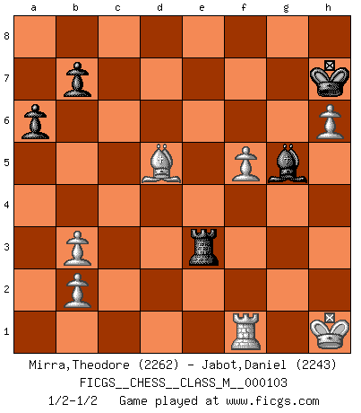 Last move : 1/2-1/2 2022 November 14 14:10:7 [Event "FICGS__CHESS__CLASS_M__000103"] [Site "FICGS"] [Date "2022.07.04"] [Round "1"] [White "Mirra,Theodore"] [Black "Jabot,Daniel"] [Result "1/2-1/2"] [WhiteElo "2262"] [BlackElo "2243"] 1.e4 c5 2.Nf3 d6 3.d4 cxd4 4.Nxd4 Nf6 5.Nc3 a6 6.h3 e5 7.Nb3 Be6 8.Be3 Be7 9.f4 Nc6 10.f5 Bxb3 11.axb3 Nb4 12.g3 O-O 13.Bg2 Qc7 14.O-O Rad8 15.Kh1 d5 16.exd5 Rd7 17.Qd2 h6 18.Rae1 Re8 19.Bxh6 gxh6 20.Qxh6 Qd6 21.g4 Nxc2 22.Rd1 e4 23.g5 Ng4 24.hxg4 Qxh6+ 25.gxh6 Ne3 26.Nxe4 Nxf1 27.Rxf1 Rxd5 28.Nf6+ Bxf6 29.Bxd5 Kh7 30.Bxf7 Re3 31.g5 Bxg5 32.Bd5 1/2-1/2 Sicilian : Najdorf, Adams attack Kingside Castling by player Black (move 12) Kingside Castling by player White (move 14) This chess game ended in a draw. Follow this game move after move (download)Openings teach you openings. Endgames teach you chess ! (Stephan Gerzadowicz) Der Knackpunkt bei der Konzentration ist, daß wir nur durch sie etwas Neues und Ungewöhnliches am Schachbrett finden können. Sie ist der einzige Weg durch neue neue Ideen eine Überraschung zu bereiten. (Garry Kasparov) El Ajedrez moderno está demasiado preocupado con cosas como la estructura de Peones. Olvidenlo, el Jaque Mate termina la partida. (Nigel Short) Fischer est le meilleur joueur du monde et Karpov n'est qu'un joueur de bistrot. (Garry Kasparov, agé de 16 ans) Logic : The art of thinking and reasoning in strict accordance with the limitations and incapacities of the human misunderstanding. (Ambrose Bierce)