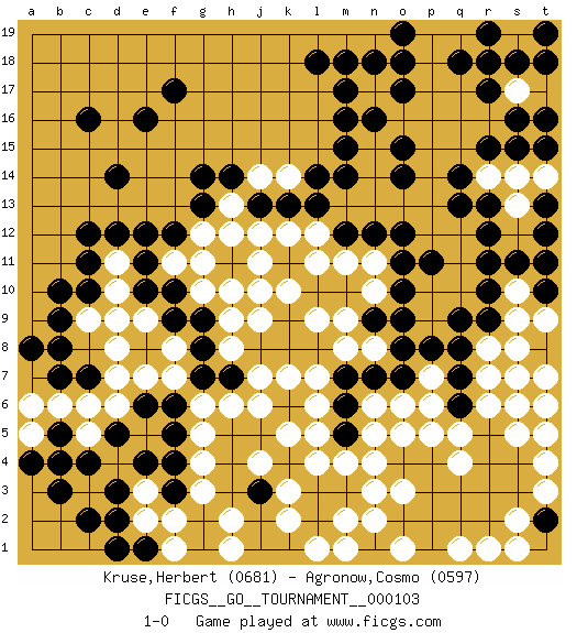 Last move : 1-0 2022 November 30 16:12:6 [Event "FICGS__GO__TOURNAMENT__000103"] [Site "FICGS"] [Date "2022.07.04"] [Round "1"] [Black "Kruse,Herbert"] [White "Agronow,Cosmo"] [Result "1-0"] [Rating 1 "0681"] [Rating 2 "0597"] 1.c16 q4 2.d3 q17 3.f17 g4 4.d5 l4 5.r15 p15 6.q16 p16 7.r17 p17 8.r18 q10 9.q13 p13 10.r3 e7 11.r4 q5 12.q3 p3 13.p2 o3 14.o2 n2 15.r5 r6 16.n3 n4 17.m3 m2 18.q6 p6 19.q7 p7 20.q8 p9 21.l3 k3 22.l2 k2 23.o4 m4 24.p4 p5 25.p8 o8 26.o7 o6 27.n7 n6 28.m6 n5 29.s8 r8 30.r9 r7 31.q9 l1 32.o9 n8 33.m7 p10 34.k4 o3 35.n9 m8 36.l8 m9 37.m10 l9 38.k9 s9 39.r10 n10 40.l10 g11 41.n16 n15 42.m15 n14 43.m17 k12 44.q14 p14 45.m14 m13 46.l13 l12 47.m12 n13 48.k13 j12 49.o12 p12 50.n12 m11 51.o10 n11 52.p11 q11 53.o11 l11 54.j13 h12 55.g14 h13 56.h14 n3 57.e11 d9 58.f10 h9 59.g8 h8 60.h7 j7 61.g7 j6 62.e8 d8 63.j8 s10 64.r11 q12 65.s11 s7 66.c11 f8 67.f9 e9 68.g9 g10 69.t8 t7 70.c7 j9 71.k8 k5 72.f5 g6 73.f6 g5 74.t6 t9 75.t5 s5 76.s4 s6 77.c12 s12 78.r12 t11 79.r13 q15 80.s15 s14 81.n18 o16 82.f3 g3 83.g2 h2 84.g1 h1 85.m18 r16 86.s16 r14 87.q18 s13 88.o8 k10 89.j11 j10 90.h11 f11 91.e10 f7 92.p3 t4 93.t5 t3 94.t2 t6 95.s3 t5 96.r2 t14 97.t12 s17 98.s18 t17 99.b3 q16 100.t18 t13 101.l18 s1 102.t19 p18 103.m5 l5 104.e16 l7 105.d14 s2 106.t16 q19 107.a8 d11 108.d12 d10 109.k11 h10 110.f12 j11 111.b10 h6 112.n1 m1 113.p1 o1 114.r19 p19 115.o17 k7 116.m16 m9 117.f4 f2 118.c2 e3 119.n1 m8 120.e12 e5 121.e4 e2 122.o14 l6 123.t15 r1 124.t12 l9 125.e6 n8 126.g13 g12 127.o18 q1 128.q2 o1 129.t8 o5 130.o15 o13 131.j3 j4 132.b4 s14 133.t10 s8 134.t11 r14 135.o19 k14 136.d1 s13 137.t13 d6 138.e1 f1 139.d2 c6 140.b7 b6 141.b8 d7 142.b5 a6 143.c10 c5 144.c4 a5 145.a4 c9 146.b9 j14 147.l14 s17 148.o14 t14 149.o15 1-0 Here are the names of the openings (joseki) played in the four corners : Corner d4 : d3 g4 Komoku (Somok, Xiao~mu`) 3-4 Point. The komoku (3-4) point is the traditional corner enclosure move.. Corner q16 : q17 r15 Komoku (Somok, Xiao~mu`) 3-4 Point. The komoku (3-4) point is the traditional corner enclosure move.. Ikken Kakari (Hankan Keolch'im, Yi Gua`jiao~, 1-Space Low Pincer). The small knight move is the basic approach move to the 3-4 point stone. It has been continually used for over four centuries. There are limitless variations, with new moves constantly being discovered. Black 2 opens the door to a treaure store of joseki. Player Black won this Go (weiqi, baduk) game. Follow this game move after move (download)Win the early ko to win the game. (Anonymous) If you know the enemy and know yourself you need not fear the results of a hundred battles. (Sun Tzu)