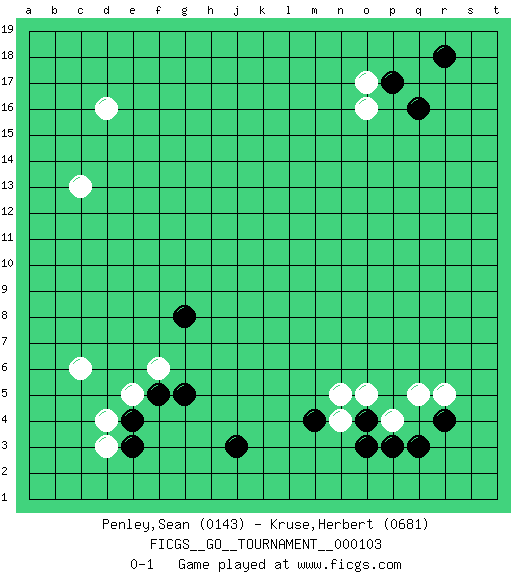 Last move : 0-1 2022 August 20 12:43:31 [Event "FICGS__GO__TOURNAMENT__000103 "] [Site "FICGS"] [Date "2022.07.04"] [Round "1"] [Black "Penley,Sean "] [White "Kruse,Herbert "] [Result "0-1"] [Rating 1 "0143"] [Rating 2 "0681"] 1.q16 d3 2.q3 d16 3.j3 q5 4.r4 o17 5.p17 o16 6.r18 c6 7.e3 d4 8.e4 e5 9.f5 f6 10.g5 c13 11.g8 r5 12.o4 o5 13.m4 p4 14.p3 n4 15.o3 n5 0-1 This go game has been lost on time (started : 2022.07.04 18:56:54) Here are the names of the openings (joseki) played in the four corners : Corner d4 : d3 j3Komoku (Somok, Xiao~mu`) 3-4 Point. The komoku (3-4) point is the traditional corner enclosure move.. Corner q4 : q3 q5Komoku (Somok, Xiao~mu`) 3-4 Point. The komoku (3-4) point is the traditional corner enclosure move..Ikken Takagakari (Hankan Nop'dakeolch'im, Yi Gaogua`jiao~, 1-Space High Approach). The 5-4 approach move has become more popular in modern times, as modern Go emphasizes speed and influence. Corner q16 : q16 o17Hoshi (Hwajeom, Seongjeom, Xingwei`) 4-4 Point. The star or hoshi (4-4) point, emphasizing influence at the potential expense of territory.Ikken Kakari (Hankan Keolch'im, Yi Gua`jiao~, 1-Space Low Approach). White 2 is the standard approach move to the 4-4. Player White won this Go (weiqi, baduk) game.Follow this game move after move (download ) In opponents' sphere of influence, avoid sharp conflict, don't move too deep. (Otake Hideo, 9p) Computers have lots of memory but no imagination. (Anonymous)