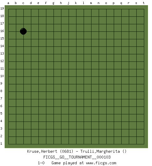 Last move : 1-0 2022 August 4 10:7:56 [Event "FICGS__GO__TOURNAMENT__000103"] [Site "FICGS"] [Date "2022.07.04"] [Round "1"] [Black "Kruse,Herbert"] [White "Trulli,Margherita"] [Result "1-0"] [Rating 1 "0681"] 1.c16 1-0 This go game has been lost on time (started : 2022.07.04 18:56:54) Here are the names of the openings (joseki) played in the four corners : Player Black won this Go (weiqi, baduk) game. Follow this game move after move (download)Each step in a ladder is worth 7 points. (Anonymous) Children in the dark cause accidents, accidents in the dark cause children. (Unknown)