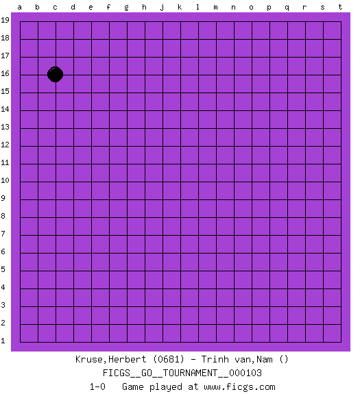Last move : 1-0 2022 August 4 10:7:56 [Event "FICGS__GO__TOURNAMENT__000103"] [Site "FICGS"] [Date "2022.07.04"] [Round "1"] [Black "Kruse,Herbert"] [White "Trinh van,Nam"] [Result "1-0"] [Rating 1 "0681"] 1.c16 1-0 This go game has been lost on time (started : 2022.07.04 18:56:54) Here are the names of the openings (joseki) played in the four corners : Player Black won this Go (weiqi, baduk) game. Follow this game move after move (download)To emphasize the lack of determination in his moves, one speaks of chance. (Pierre Audouard) Wikichess, chess moves explained by 'experimented' players. (Thibault de Vassal)