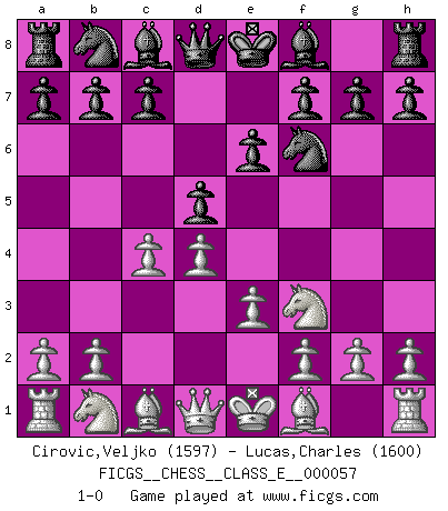 Last move : 1-0 2007 September 15 2:23:9 [Event "FICGS__CHESS__CLASS_E__000057"] [Site "FICGS"] [Date "2007.08.02"] [Round "1"] [White "Cirovic,Veljko"] [Black "Lucas,Charles"] [Result "1-0"] [WhiteElo "1597"] [BlackElo "1600"] 1.d4 d5 2.e3 Nf6 3.c4 e6 4.Nf3 1-0 This chess game has been lost on time (started : 2007.08.02 12:3:17) Queen's pawn game Player White won this chess game. Follow this game move after move (download)Avoid the crowd. Do your own thinking independently. Be the Chess player, not the Chess piece. (Ralph Charell) Kein Großmeister ist normal. Sie unterscheiden sich nur im Ausmaß Ihrer Verrücktheit. (Viktor Kortschnoi) El juego de Damas es para vagabundos. (Paul Morphy) Aux échecs, les retours au sommet sont rares : les dommages psychologiques consécutifs à une défaite sont trop sévères. (Daily Telegraph) The difference between stupidity and genius is that genius has its limits. (Murphy)