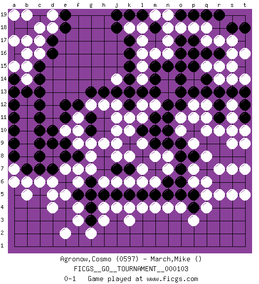 Last move : 0-1 2022 December 9 4:2:1 [Event "FICGS__GO__TOURNAMENT__000103"] [Site "FICGS"] [Date "2022.07.04"] [Round "1"] [Black "Agronow,Cosmo"] [White "March,Mike"] [Result "0-1"] [Rating 1 "0597"] 1.d16 q4 2.r16 d4 3.c7 f3 4.e8 c17 5.d17 c16 6.c15 b15 7.c14 b14 8.b13 d18 9.e18 d19 10.e19 c18 11.a14 b16 12.a13 a15 13.c13 r10 14.p10 q8 15.o8 k8 16.k5 k3 17.m5 m4 18.n5 n4 19.o5 o4 20.b18 b19 21.b17 a17 22.a18 a19 23.g6 r17 24.q16 q17 25.p17 p18 26.o17 o18 27.n18 s16 28.s15 s17 29.t15 n17 30.m18 p16 31.o16 r15 32.p15 q15 33.p16 s14 34.q14 r14 35.r13 t14 36.q13 s12 37.s13 t16 38.t13 b5 39.b7 p6 40.o6 h9 41.g11 j11 42.j13 l12 43.m14 m8 44.n11 m10 45.n9 h12 46.g13 j6 47.j5 f9 48.e9 f7 49.e6 f6 50.f5 g5 51.g4 h6 52.h5 g7 53.g5 l14 54.l13 k13 55.m13 j14 56.h13 l15 57.k12 j12 58.k14 k11 59.k13 l6 60.l5 g12 61.f12 f11 62.e12 e10 63.e11 f10 64.d10 n7 65.o7 e7 66.d7 e5 67.d6 m12 68.n12 m16 69.k15 l17 70.k17 l18 71.m17 n16 72.k16 l16 73.n15 k18 74.j18 m19 75.k19 n19 76.j19 p14 77.o15 q11 78.m15 p12 79.p13 p9 80.o9 o10 81.n10 o11 82.o12 p11 83.r12 s11 84.r11 q10 85.t15 s15 86.f8 g8 87.m9 l9 88.m11 l11 89.l10 k10 90.g10 g9 91.j9 j8 92.j7 k6 93.k7 l7 94.k9 m10 95.o13 h3 96.g3 g2 97.l10 j10 98.m10 m6 99.n6 n8 100.s10 s9 101.l19 t10 102.q7 p7 103.p8 q6 104.p5 q5 105.k9 j9 106.r8 r7 107.p4 p3 108.q19 a6 109.p19 q18 110.r19 a7 111.a8 b8 112.a9 b9 113.a10 b10 114.a11 b11 115.a12 d8 116.d9 c8 117.c11 d5 118.o19 b12 119.c12 b6 120.m18 n18 121.c10 c6 122.t12 j4 123.c9 f4 124.t11 s10 125.s8 s7 126.s18 l4 127.b18 k4 128.t18 h4 129.r9 e2 130.t8 t7 131.r6 r5 132.s6 s5 133.c7 pass 134.d7 pass 135.t6 t5 136.q9 t9 137.b7 d6 138.c8 q12 139.a18 b17 140.o14 pass 0-1 Here are the names of the openings (joseki) played in the four corners : Corner d4 : d4 c7 Hoshi (Hwajeom, Seongjeom, Xingwei`) 4-4 Point. The star or hoshi (4-4) point, emphasizing influence at the potential expense of territory. Niken Kakari (Dukan Keolch'im, E`r Gua`jiao~, 2-Space Low Approach). White typically answers by 7-3 or 3-5 (which is not joseki). Corner d16 : d16 c17 Hoshi (Hwajeom, Seongjeom, Xingwei`) 4-4 Point. The star or hoshi (4-4) point, emphasizing influence at the potential expense of territory. Corner q16 : r16 r17 Komoku (Somok, Xiao~mu`) 3-4 Point. The komoku (3-4) point is the traditional corner enclosure move.. This is not joseki. n invasion to take the corner after Black made a shimari-less moyo on top disabling the other moves. Player White won this Go (weiqi, baduk) game. Follow this game move after move (download)Capture what you cut off. (Anonymous) Wipe them out. All of them. (Darth Sidious in Star Wars ep.1)