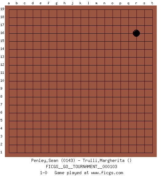 Last move : 1-0 2022 August 4 10:7:56 [Event "FICGS__GO__TOURNAMENT__000103"] [Site "FICGS"] [Date "2022.07.04"] [Round "1"] [Black "Penley,Sean"] [White "Trulli,Margherita"] [Result "1-0"] [Rating 1 "0143"] 1.r16 1-0 This go game has been lost on time (started : 2022.07.04 18:56:54) Here are the names of the openings (joseki) played in the four corners : Player Black won this Go (weiqi, baduk) game. Follow this game move after move (download)When your opponent has two weak groups, attack them both at once. (Anonymous) Programming can only do so much before it becomes too much. (Don Groves)