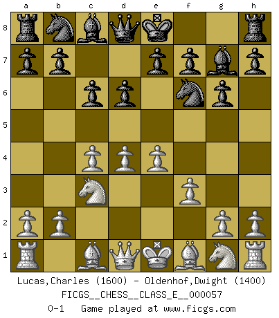 Last move : 0-1 2007 October 3 11:4:56 [Event "FICGS__CHESS__CLASS_E__000057"] [Site "FICGS"] [Date "2007.08.02"] [Round "1"] [White "Lucas,Charles"] [Black "Oldenhof,Dwight"] [Result "0-1"] [WhiteElo "1600"] [BlackElo "1400"] 1.d4 Nf6 2.c4 d6 3.Nc3 g6 4.e4 c6 5.f3 Bg7 0-1 This chess game has been lost on time (started : 2007.08.02 12:3:17) Old Indian defense Player Black won this chess game. Follow this game move after move (download)Chess books should be used as we use glasses: to assist the sight, although some players make use of them as if they thought they conferred sight. (Jose Raul Capablanca) Sie führen leise Selbstgespräche, schlürfen lautstark ihre Getränke, schmatzen hörbar beim Essen, blasen ihrem Gegenüber Rauch in die Augen, niesen ihm ins Gesicht, starren ihn unverwandt an, bis er sich unter ihren Blicken windet, rutschen ständig auf ihrem Stuhl hin und her, rülpsen und bohren in der Nase. (Anonymous) Todo se encuentra en un estado de flujo y esto incluye al mundo del Ajedrez. (Mikhail Botvinnik) C'est la seule position que je connaisse où les deux camps sont mals. Propos prêtés à V. Anand. Warrior pose battles inner weakness and wins focus. You see that there is no war within you. You're on your own side, and you are your own strength. (Terri Guillemets)
