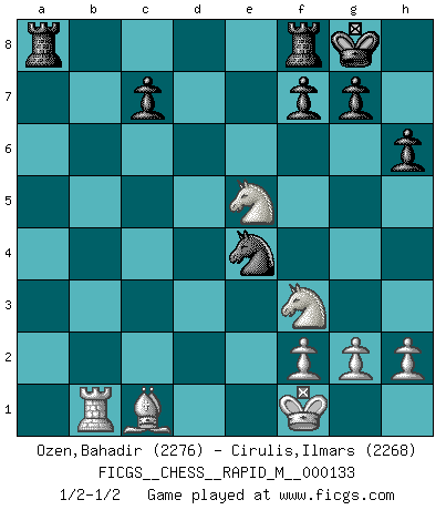 Last move : 1/2-1/2 2022 July 24 10:40:13 [Event "FICGS__CHESS__RAPID_M__000133"] [Site "FICGS"] [Date "2022.07.05"] [Round "1"] [White "Ozen,Bahadir"] [Black "Cirulis,Ilmars"] [Result "1/2-1/2"] [WhiteElo "2276"] [BlackElo "2268"] 1.e4 e5 2.Nf3 Nc6 3.Bb5 Nf6 4.d3 Bc5 5.c3 O-O 6.O-O d5 7.Nbd2 dxe4 8.dxe4 Qe7 9.b4 Bb6 10.a3 a5 11.Rb1 axb4 12.axb4 h6 13.Qc2 Be6 14.Bxc6 bxc6 15.c4 Bd4 16.Nb3 Qxb4 17.Nbxd4 Qxc4 18.Qxc4 Bxc4 19.Nxc6 Bxf1 20.Kxf1 Nxe4 21.Ncxe5 1/2-1/2 Ruy Lopez : Berlin defense Kingside Castling by player Black (move 5) Kingside Castling by player White (move 6) This chess game ended in a draw. Follow this game move after move (download)The passion for playing Chess is one of the most unaccountable in the world. (H.G. Wells) Mein erstes Ziel war nicht, die Partie zu gewinnen, sondern eine Figur zu opfern. -- der junge (Wilhelm Steinitz) Bobby Fischer es el jugador de Ajedrez mas grande que jamás haya existido. (Ken Smith) La conception d'un plan est le processus par lequel un joueur exploite les avantages de sa position tout en s'efforçant d'en réduire au minimum les inconvénients. Afin de garantir le succès, un plan doit toujours se fonder sur un diagnostic objectif des particularités d'une position. La conception d'un plan est d'autant plus difficile que la position est équilibrée, et grandement facilitée lorsqu'il n'existe qu'un seul plan susceptible de répondre aux exigences de la position. (Harry Golombek) Mandala - that's it! 16x16 squares as multiple of the four and the eight because of the Four Noble Truths and the Noble Eightfold Path. (Heinz-Georg Lehnhoff about Big Chess)