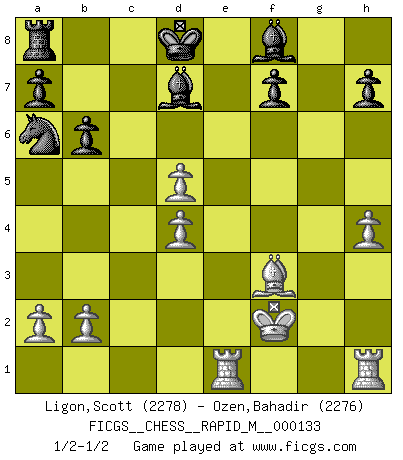 Last move : 1/2-1/2 2022 July 17 13:40:34 [Event "FICGS__CHESS__RAPID_M__000133"] [Site "FICGS"] [Date "2022.07.05"] [Round "1"] [White "Ligon,Scott"] [Black "Ozen,Bahadir"] [Result "1/2-1/2"] [WhiteElo "2278"] [BlackElo "2276"] 1.e4 e5 2.f4 exf4 3.Nf3 g5 4.h4 g4 5.Ne5 Nf6 6.Nxg4 Nxe4 7.d3 Ng3 8.Bxf4 Qe7+ 9.Be2 Rg8 10.Bxg3 Rxg4 11.Bf2 Rxg2 12.Nc3 d5 13.Nxd5 Qe5 14.c4 c6 15.d4 Qf5 16.Bf3 Rxf2 17.Kxf2 cxd5 18.Qa4+ Bd7 19.Rae1+ Kd8 20.Qa5+ b6 21.Qxd5 Qxd5 22.cxd5 Na6 1/2-1/2 KGA : Kieseritsky, Berlin defense This chess game ended in a draw. Follow this game move after move (download)You cannot play at Chess if you are kind-hearted. (French Proverb) Ich liebe den Moment, wenn ich das Ego meines Gegenüber breche. (Robert James Fischer) Fischer sacrificó virtualmente todo lo que la mayoría de nosotros los 'debiles' (término que él usa) valoramos, respetamos y apreciamos por el amor de un astuto, a menudo hermoso tablero de juego, por el privilegio ambivalente de ser su mas grande maestro. (Paul Kollar) Vous m'avez demandé de vous exposer quel est le fondement de la prière. Je ne fais que préparer les pièces du jeu sur la table... Nous sera-t-il permis d'en adopter les règles et si nous les appliquons scrupuleusement nous ne tarderons pas à faire mat le Roi divin ! Il ne pourra échapper à nos mains. (Sainte Thérèse d'Avila, Chemin de perfection) Indecision is the key to flexibility. (Unknown)