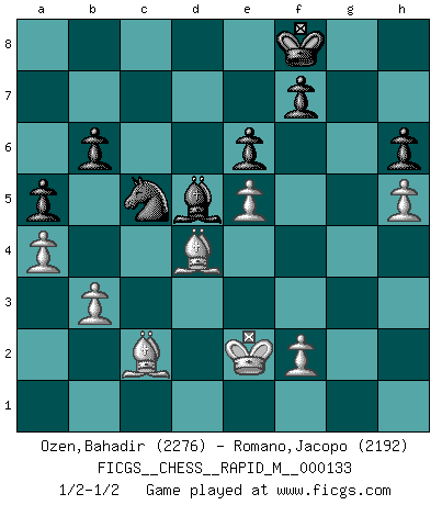 Last move : 1/2-1/2 2022 September 16 17:40:11 [Event "FICGS__CHESS__RAPID_M__000133"] [Site "FICGS"] [Date "2022.07.05"] [Round "1"] [White "Ozen,Bahadir"] [Black "Romano,Jacopo"] [Result "1/2-1/2"] [WhiteElo "2276"] [BlackElo "2192"] 1.d4 d5 2.c4 e6 3.Nc3 Nf6 4.Nf3 dxc4 5.e3 a6 6.a4 b6 7.Bxc4 Bb7 8.O-O Bb4 9.Qe2 O-O 10.Rd1 Qe7 11.Bd3 c5 12.e4 cxd4 13.Nxd4 Nbd7 14.e5 Nd5 15.Nxd5 Bxd5 16.Nc2 a5 17.Nxb4 Qxb4 18.h3 Nc5 19.Bc2 Rac8 20.Be3 Nd7 21.Rd4 Rc4 22.Qd3 g6 23.Rxc4 Qxc4 24.Qxc4 Bxc4 25.Rc1 Rc8 26.Bd1 Ba6 27.Rxc8+ Bxc8 28.g4 Bb7 29.Kh2 Nc5 30.h4 Kg7 31.Bd4 Bd5 32.Kg3 h6 33.Kf4 Bc6 34.b3 Bd5 35.Ke3 Kf8 36.Bc2 Kg7 37.h5 gxh5 38.gxh5 Kf8 39.Ke2 1/2-1/2 QGD : 4.Nf3 Kingside Castling by player White (move 8) Kingside Castling by player Black (move 9) This chess game ended in a draw. Follow this game move after move (download)Avoid the crowd. Do your own thinking independently. Be the Chess player, not the Chess piece. (Ralph Charell) Ein guter Spieler hat immer Glück. (José Raúl Capablanca) Con el tiempo, empecé a progresar en partidas decisivas. Tal vez porque me di cuenta de una simple verdad: no solo estaba yo nervioso sino también mi oponente. (Mikhail Tal) Aux échecs, les retours au sommet sont rares : les dommages psychologiques consécutifs à une défaite sont trop sévères. (Daily Telegraph) There are lots of people who mistake their imagination for their memory. (Josh Bilings)