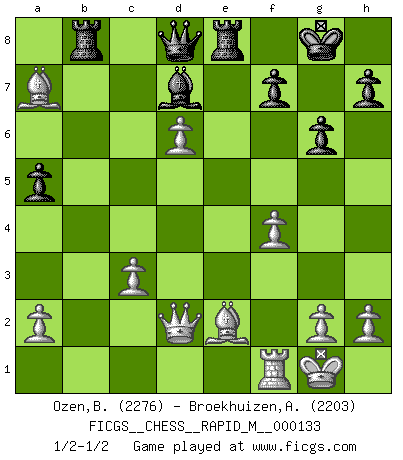 Last move : 1/2-1/2 2022 July 14 8:28:31 [Event "FICGS__CHESS__RAPID_M__000133"] [Site "FICGS"] [Date "2022.07.05"] [Round "1"] [White "Ozen,Bahadir"] [Black "Broekhuizen,A. T. S."] [Result "1/2-1/2"] [WhiteElo "2276"] [BlackElo "2203"] 1.d4 Nf6 2.c4 g6 3.Nc3 d5 4.cxd5 Nxd5 5.e4 Nxc3 6.bxc3 Bg7 7.Nf3 c5 8.Rb1 O-O 9.Be2 Nc6 10.d5 Ne5 11.Nxe5 Bxe5 12.Qd2 e6 13.f4 Bc7 14.O-O exd5 15.exd5 Ba5 16.d6 Rb8 17.Rb5 b6 18.Rxa5 bxa5 19.Ba3 Bd7 20.Bxc5 Re8 21.Bxa7 1/2-1/2 King's Indian defense, 3.Nc3 Kingside Castling by player Black (move 8) Kingside Castling by player White (move 14) This chess game ended in a draw. Follow this game move after move (download)Chess, like any creative activity, can exist only through the combined efforts of those who have creative talent, and those who have the ability to organize their creative work. (Mikhail Botvinnik) Kein Schachspieler kann gut schlafen. (H. G. Wells) Cada Peón es una Reina en potencia. (James Mason) Karpov est une pièce de musée. (Garry Kasparov) You can't play chess if you're groggy from pills. (Anatoly Karpov)