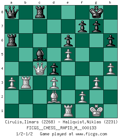 Last move : 1/2-1/2 2022 August 2 13:48:39 [Event "FICGS__CHESS__RAPID_M__000133"] [Site "FICGS"] [Date "2022.07.05"] [Round "1"] [White "Cirulis,Ilmars"] [Black "Hallqvist,Niklas"] [Result "1/2-1/2"] [WhiteElo "2268"] [BlackElo "2231"] 1.Nf3 c5 2.c4 Nc6 3.Nc3 Nf6 4.g3 e6 5.Bg2 Qb6 6.e4 Be7 7.O-O d6 8.d3 O-O 9.Rb1 h6 10.a3 a6 11.b4 Qd8 12.bxc5 dxc5 13.Bf4 Nd7 14.e5 Ra7 15.h4 b6 16.Re1 Bb7 17.Ne4 Ba8 18.Qc1 Re8 19.Rb2 Nd4 20.Nxd4 cxd4 21.Rb3 Nc5 22.Nxc5 Bxc5 23.Bxa8 Qxa8 24.Bd2 b5 25.cxb5 Rc8 26.bxa6 Rxa6 27.Qc4 1/2-1/2 Reti Opening Kingside Castling by player White (move 7) Kingside Castling by player Black (move 8) This chess game ended in a draw. Follow this game move after move (download)There are two types of sacrifices: correct ones and mine. (Mikhail Tal) Im Schach nämlich geht es darum, daß Ich des Gegners klein zu kriegen, sein Ego zu zerbrechen und zu zermahlen, seine Selbstachtung zu zertreten und zu verscharren und seine ganze mißachtenswerte sogenannte Persönlichkeit ein für alle Mal tot zu hacken und zu zerstampfen und dadurch die menschliche Gesellschaft von einer stinkenden Pestbeule zu befreien. Es ist ein königliches Spiel. (Robert James Fischer) ¿Porque tengo que perder ante este idiota?. (Aron Nimzovich) Les échecs sont plus proches de l'art de l'assassinat que de l'art de la guerre. (Arturo Perez-Reverte) Happy endings are just stories that haven't finished yet. (Jane Smith in Mr & Mrs Smith)