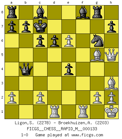 Last move : 1-0 2022 July 13 9:6:57 [Event "FICGS__CHESS__RAPID_M__000133"] [Site "FICGS"] [Date "2022.07.05"] [Round "1"] [White "Ligon,Scott"] [Black "Broekhuizen,A. T. S."] [Result "1-0"] [WhiteElo "2278"] [BlackElo "2203"] 1.e4 e5 2.f4 exf4 3.Bc4 Nc6 4.Nf3 g5 5.d4 g4 6.O-O gxf3 7.Qxf3 Qe7 8.Nc3 Nxd4 9.Qxf4 Ne6 10.Qf3 c6 11.e5 f5 12.Ne4 fxe4 13.Qh5+ Kd8 14.Bxe6 Kc7 15.Bh3 Qc5+ 16.Kh1 Ne7 17.b4 Qd4 18.Rb1 Rg8 19.e6 d6 20.Bf4 Ng6 21.Rbd1 Qxb4 22.Bg5 1-0 KGA : Bishop's gambit, Maurian defense Kingside Castling by player White (move 6) Player White won this chess game. Follow this game move after move (download)Of all my Russian books, the defense contains and diffuses the greatest 'warmth' which may seem odd seeing how supremely abstract Chess is supposed to be. (Vladimir Nabokov) Schach ist Krieg, im Schach geht es um testosterongesteuerte Urschreie. (Garry Kasparov) El Ajedrez es sobre todo, ¡una pelea!. (Emanuel Lasker) Je ne suis pas le dernier à jouer lâchement des coups douteux pendant le zeïtnot de l'adversaire pour l'achever: en effet les coups qui font le plus peur sont ceux que l'on ne comprend pas. Je me fais souvent peur quand je joue. (Un professeur anonyme) Your best chance to get a Royal Flush in a casino is in the bathroom. (Anonymous)