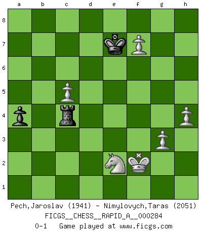 Last move : 0-1 2023 February 8 10:25:19 [Event "FICGS__CHESS__RAPID_A__000284"] [Site "FICGS"] [Date "2022.07.10"] [Round "1"] [White "Pech,Jaroslav"] [Black "Nimylovych,Taras"] [Result "0-1"] [WhiteElo "1941"] [BlackElo "2051"] 1.e4 e5 2.Nf3 Nc6 3.Bb5 Nf6 4.O-O Nxe4 5.d4 Nd6 6.Bxc6 dxc6 7.dxe5 Nf5 8.Qxd8+ Kxd8 9.Nc3 Be7 10.Rd1+ Ke8 11.h3 h5 12.Bg5 Be6 13.g3 Rc8 14.Kg2 f6 15.Bf4 Kf7 16.a3 c5 17.exf6 gxf6 18.Nb5 c6 19.Nc7 Rxc7 20.Bxc7 Bd5 21.Rd3 Nd4 22.Rad1 Rc8 23.Ba5 b5 24.R1d2 Bf8 25.b3 Bh6 26.Rxd4 cxd4 27.Rxd4 Re8 28.c4 bxc4 29.bxc4 Be4 30.Bb4 f5 31.Rd7+ Kg8 32.Bd6 c5 33.a4 a5 34.Bc7 Ra8 35.Bd6 Bc6 36.Rc7 Be4 37.Rd7 Re8 38.Bxc5 Rb8 39.h4 Rb3 40.Rd8+ Kf7 41.Rd7+ Ke8 42.Re7+ Kd8 43.Rxe4 fxe4 44.Ng5 Ke8 45.Nxe4 Bf8 46.Nf6+ Kf7 47.Bxf8 Kxf8 48.c5 Rb4 49.Nd7+ Kf7 50.Nb6 Ke6 51.f4 Kf5 52.Kf3 Rb3+ 53.Kf2 Rc3 54.Nd7 Ke6 55.Nf8+ Kd5 56.Nd7 Kc6 57.Nf6 Rc4 58.Nxh5 Rxa4 59.f5 Rd4 60.Nf4 a4 61.Ne2 Rc4 62.f6 Kd7 63.f7 Ke7 0-1 Ruy Lopez : Berlin defense, Open variation Kingside Castling by player White (move 4) 10 pieces endgame at move 58 : White KNPPPPP , Black KRP WHITE : King + 1 Knight 5 Pawns BLACK : King + 1 Rook 1 Pawn 9 pieces endgame at move 58 : White KNPPPP , Black KRP WHITE : King + 1 Knight 4 Pawns BLACK : King + 1 Rook 1 Pawn Player Black won this chess game. Follow this game move after move (download)Chess demands total concentration. (Bobby Fischer) Im Schach gewinnt jeder. Hat man Freunde am Spiel - und das ist die Hauptsache - ist auch der Verlust einer Partie kein Unglück. (David Bronstein) ¿Esta Bobby Fischer algo cuerdo?. (Salo Flohr) La tactique, c'est ce que vous faites quand il y a quelque chose à faire; la stratégie, c'est ce que vous faites quand il n'y a rien à faire. (Savielli Tartacower) You can only get smarter by playing a smarter opponent. (Revolver, movie)