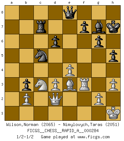 Last move : 1/2-1/2 2022 September 18 9:51:56 [Event "FICGS__CHESS__RAPID_A__000284"] [Site "FICGS"] [Date "2022.07.10"] [Round "1"] [White "Wilson,Norman"] [Black "Nimylovych,Taras"] [Result "1/2-1/2"] [WhiteElo "2065"] [BlackElo "2051"] 1.e4 e5 2.Nf3 Nc6 3.Bb5 Nf6 4.d3 Bc5 5.c3 O-O 6.Nbd2 Re8 7.O-O a6 8.Bc4 Bf8 9.Re1 d6 10.Bb3 Na5 11.Bc2 c5 12.Nc4 h6 13.Nxa5 Qxa5 14.a4 Bd7 15.h3 b5 16.Nh2 Qd8 17.Bd2 Rb8 18.axb5 axb5 19.Bb3 Be6 20.Bxe6 Rxe6 21.Ra6 Qc8 22.Ra7 Ra8 23.Rxa8 Qxa8 24.Qb3 Re8 25.Nf1 Rb8 26.Bc1 g6 27.Ne3 h5 28.Nc2 Qb7 29.Na3 Ne8 30.Bg5 Nc7 31.Ra1 Ra8 32.Rf1 Qc6 33.Bc1 Qd7 34.f4 exf4 35.Bxf4 Re8 36.Qc2 Bg7 37.Qd2 Rd8 38.Qf2 b4 39.cxb4 cxb4 40.Nc4 Ne6 41.Be3 Nc5 42.Nb6 Qe6 43.Qc2 b3 44.Qd2 Kh7 45.Nd5 Rf8 46.Nc3 Rc8 47.Rf3 Qe8 48.Kh1 Rc7 1/2-1/2 Ruy Lopez : Berlin defense Kingside Castling by player Black (move 5) Kingside Castling by player White (move 7) This chess game ended in a draw. Follow this game move after move (download)In Chess, at least, the brave inherit the earth. (Edmar Mednis) Schachspieler können ausgezeichnet Varianten am Schachbrett berechnen, aber nicht im realen Leben. Zu stark ist der Individualismus im Schach ausgeprägt, und für viele ist ein kleiner momentaner persönlicher Vorteil wichtiger als ein weit größerer Vorteil von morgen. (Anatoly Karpov) Los Peones son nacidos libres, y aún así, se encuentran encadenados por todos lados. (Rick Kennedy) Donnez-moi un Cavalier en 6e et je gagnerais toutes mes parties. (Steinitz) Luck never gives; it only lends. (Swedish proverb)