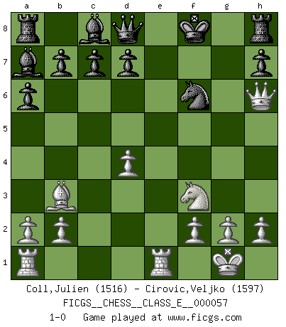 Last move : 1-0 2007 December 28 20:39:33 [Event "FICGS__CHESS__CLASS_E__000057"] [Site "FICGS"] [Date "2007.08.02"] [Round "1"] [White "Coll,Julien"] [Black "Cirovic,Veljko"] [Result "1-0"] [WhiteElo "1516"] [BlackElo "1597"] 1.e4 e5 2.Nf3 Nc6 3.Bb5 a6 4.Ba4 Bc5 5.c3 Qf6 6.d4 exd4 7.e5 Qe7 8.cxd4 Ba7 9.O-O Kf8 10.Nc3 f6 11.Nd5 Qd8 12.Re1 Nge7 13.Nxe7 Nxe7 14.exf6 Nd5 15.fxg7+ Kxg7 16.Bb3 Nf6 17.Bh6+ Kxh6 18.Qd2+ Kg7 19.Qg5+ Kf8 20.Qh6+ 1-0 Ruy Lopez : Classical defense deferred Kingside Castling by player White (move 9) Player White won this chess game. Follow this game move after move (download)You sit at the board and suddenly your heart leaps. Your hand trembles to pick up the piece and move it. But what Chess teaches you is that you must sit there calmly and think about whether it's really a good idea and whether there are other better ideas. (Stanley Kubrick) Ein Großmeister muß tausende Partien in seinem Kopf speichern, denn diese sind für Ihn, was die Worte der Muttersprache für gewöhnliche Leute sind, oder Noten für Musiker... (Garry Kasparov) Las combinaciones han sido siempre el aspecto más intrigante del Ajedrez. Los Maestros las buscan, el público las aplauden, los críticos las alaban. La razón se debe a que las combinaciones hacen posible que el Ajedrez sea más que un ejercicio matemático con una carencia de vida. Ellas son la poesía del juego, son del Ajedrez lo que la melodía es de la música. Ellas representan el triunfo de la mente sobre la materia. (Reuben Fine) Donnez-moi un Cavalier en 6e et je gagnerais toutes mes parties. (Steinitz) Nobody is always a winner, and anybody who says he is, is either a liar or doesn't play poker. (Amarillo Slim)