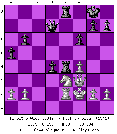Last move : 0-1 2022 September 29 17:31:50 [Event "FICGS__CHESS__RAPID_A__000284"] [Site "FICGS"] [Date "2022.07.10"] [Round "1"] [White "Terpstra,Wiep"] [Black "Pech,Jaroslav"] [Result "0-1"] [WhiteElo "1912"] [BlackElo "1941"] 1.d4 d5 2.Nf3 Nf6 3.Bf4 c5 4.e3 Nc6 5.c3 e6 6.Nbd2 Bd6 7.Bg3 O-O 8.Bd3 b6 9.Ne5 Bb7 10.f4 Ne7 11.Bf2 Ne4 12.Nef3 Nf5 13.Qe2 f6 14.O-O a5 15.c4 Nxf2 16.Rxf2 Qd7 17.Rd1 cxd4 18.Bxf5 dxe3 19.Bxe6+ Qxe6 20.R2f1 Ba6 21.Rfe1 Rfe8 22.Nd4 Qd7 23.Nf1 Bb4 24.Nxe3 Bxc4 25.Qf3 Bxe1 26.Rxe1 Re4 27.Ne2 Bxe2 28.Rxe2 Rae8 29.Kf2 d4 0-1 Queen's Bishop game Kingside Castling by player Black (move 7) Kingside Castling by player White (move 14) Player Black won this chess game. Follow this game move after move (download)Chess is a cold bath for the mind. (Sir John Simon) Die unerbitterlichsten Regeln im Schach sind die Ausnahmen. (Savielly Grigorievitsch Tartakower) La maestría del Ajedrez consiste esencialmente en analizar posiciónes de Ajedrez con precisión. (Mikhail Botvinnik) Botvinnik disait en comparant les échecs à la musique: Il existe une science dont le but est l'étude de l'acoustique et des sons. Mais il y a aussi un art qui se sert de l'océan des sons : c'est la musique. De toute évidence, il en est de même pour la pensée. La logique est l'étude des lois de la réflexion et les échecs reflètent, en tant qu'art, le côté logique de la réflexion, sous la forme d'images artistiques... Extrait de Fischer - Spassky, Reykjavik 1972 par Alexander & F. Wyndham (Ed. Solar), p 37. Some people are so afraid to die that they never begin to live. (Henry Van Dyke)