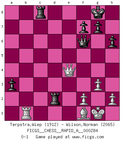 Last move : 0-1 2022 August 25 13:35:40 [Event "FICGS__CHESS__RAPID_A__000284"] [Site "FICGS"] [Date "2022.07.10"] [Round "1"] [White "Terpstra,Wiep"] [Black "Wilson,Norman"] [Result "0-1"] [WhiteElo "1912"] [BlackElo "2065"] 1.d4 d5 2.Nf3 Nf6 3.Bf4 c5 4.e3 Nc6 5.c3 Qb6 6.Qb3 c4 7.Qc2 Bf5 8.Qc1 Nh5 9.Nbd2 Nxf4 10.exf4 h6 11.Be2 Qc7 12.g3 e6 13.b3 cxb3 14.axb3 Bd6 15.O-O O-O 16.Rd1 a5 17.Nf1 Be4 18.Qb2 Rfb8 19.c4 dxc4 20.bxc4 Be7 21.Ne3 a4 22.c5 b5 23.cxb6 Rxb6 24.Qc1 Qb7 25.d5 exd5 26.Nxd5 Bxd5 27.Rxd5 Bf6 28.Re5 Bxe5 29.fxe5 Rb2 30.Bf1 Qb6 31.Qe1 a3 32.Nd2 Nxe5 33.Qxe5 Rxd2 34.Qf4 Qb2 35.Qe4 Rc8 36.Rb1 Qf6 0-1 Queen's Bishop game Kingside Castling by player White (move 15) Kingside Castling by player Black (move 15) Player Black won this chess game. Follow this game move after move (download)When I asked Fischer why he had not played a certain move in our game, he replied: 'Well, you laughed when I wrote it down !' (Mikhail Tal) Ich spiele ehrlich und spiele, um zu gewinnen. Wenn ich verliere nehme ich meine Medizin. (Robert James Fischer) Un Peón pasado es un criminal, quién debe ser mantenido bajo candado y llave. Leves medidas, tales como vigilancia policiaca, no son suficientes. (Aaron Nimzovich) Nous sommes les pions de la mystérieuse partie d'Echecs jouée par Dieu. Il nous déplace, nous arrête, nous pousse encore, puis nous lance un à un dans la boîte du Néant. Epitaphe sur la tombe de David Janowsky (1868-1927). If you have any trouble condescending, find a Unix user to show you how it's done. (Scott Adams)