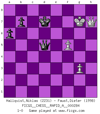 Last move : 1-0 2022 November 28 7:29:26 [Event "FICGS__CHESS__RAPID_A__000284"] [Site "FICGS"] [Date "2022.07.10"] [Round "1"] [White "Hallqvist,Niklas"] [Black "Faust,Dieter"] [Result "1-0"] [WhiteElo "2231"] [BlackElo "1998"] 1.Nf3 d5 2.g3 Nf6 3.Bg2 c6 4.O-O Bg4 5.h3 Bxf3 6.Bxf3 Nbd7 7.d4 e5 8.c4 dxc4 9.Nd2 exd4 10.Nxc4 Nb6 11.Qc2 Nxc4 12.Qxc4 Qd7 13.h4 Rd8 14.Rd1 Be7 15.Bf4 O-O 16.e3 Qe6 17.Rxd4 Qxc4 18.Rxc4 Bd6 19.Bg5 Be7 20.e4 Rfe8 21.Be3 a6 22.h5 Bf8 23.Kg2 Re6 24.Bf4 g6 25.h6 Nh5 26.Bg5 Be7 27.Bxe7 Rxe7 28.Bxh5 gxh5 29.Rh1 Re5 30.f4 Rd2+ 31.Kf3 Rb5 32.e5 R5xb2 33.Rxh5 Kf8 34.Rc3 Rxa2 35.Rf5 Rf2+ 36.Kg4 Ke7 37.Rg5 Rh2 38.Rd3 Rad2 39.Rxd2 Rxd2 40.Rg7 c5 41.Rxh7 c4 42.f5 Rd4+ 43.Kg5 c3 44.e6 Rd8 45.Rxf7+ Kd6 46.Rd7+ Rxd7 47.exd7 Kxd7 48.h7 c2 49.h8Q c1Q+ 50.Kg6 Qc6+ 51.Kh7 Qh1+ 52.Kg7 Qd5 53.Qh7 1-0 Reti : King's Indian attack, Yugoslav variation Kingside Castling by player White (move 4) Kingside Castling by player Black (move 15) 10 pieces endgame at move 46 : White KPPPP , Black KRPPP WHITE : King + 4 Pawns BLACK : King + 1 Rook 3 Pawns 9 pieces endgame at move 47 : White KPPPP , Black KPPP WHITE : King + 4 Pawns BLACK : King + 3 Pawns 8 pieces endgame at move 47 : White KPPP , Black KPPP WHITE : King + 3 Pawns BLACK : King + 3 Pawns Promotion Queen by player White (move 49) Promotion Queen by player Black (move 49) Player White won this chess game. Follow this game move after move (download)One of these modest little moves may be more embarrassing to your opponent than the biggest threat. (Siegbert Tarrasch) Schach ist mein Leben, meine Leidenschaft, was ich gelernt habe und seit meinem 14. Lebensjahr profimässig praktiziere. Darauf zu verzichten, würde mir sehr schwer fallen. (Viktor Kortschnoi) Cuando le juegas a Fischer, no es una cuestion de si vas a ganar o perder. Es una cuestion de si vas a sobrevivir. (Boris Spassky) On a dit que l'homme se distingue de l'animal par le fait qu'il achète plus de livres qu'il ne peut en lire. Je voudrais suggérer qu'inclure à la liste des livres quelques livres d'échecs rendrait la distinction manifeste. (Edward Lasker) Children in the dark cause accidents, accidents in the dark cause children. (Unknown)