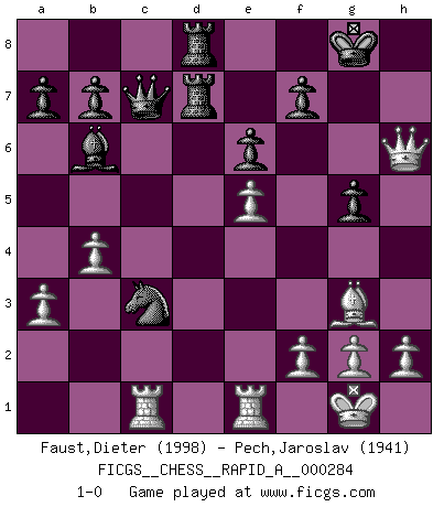 Last move : 1-0 2022 November 16 3:49:21 [Event "FICGS__CHESS__RAPID_A__000284"] [Site "FICGS"] [Date "2022.07.10"] [Round "1"] [White "Faust,Dieter"] [Black "Pech,Jaroslav"] [Result "1-0"] [WhiteElo "1998"] [BlackElo "1941"] 1.e4 c6 2.d4 d5 3.e5 Bf5 4.Nf3 e6 5.Be2 c5 6.Be3 cxd4 7.Nxd4 Ne7 8.Nd2 Nbc6 9.N2f3 Bg4 10.O-O Bxf3 11.Nxf3 Qc7 12.c4 dxc4 13.Bxc4 Nf5 14.Bf4 Rd8 15.Bd3 Bc5 16.a3 Rd7 17.Qc2 Nfd4 18.Nxd4 Bxd4 19.Rfe1 h6 20.Rab1 O-O 21.b4 Rfd8 22.Bb5 g5 23.Bg3 Bb6 24.Qe2 Nd4 25.Qh5 Nxb5 26.Rbc1 Nc3 27.Qxh6 1-0 Caro-Kann : Advance variation Kingside Castling by player White (move 10) Kingside Castling by player Black (move 20) Player White won this chess game. Follow this game move after move (download)You are for me the Queen on d8 and I am the Pawn on d7 !! (Eduard Gufeld) Ein Großmeister muß tausende Partien in seinem Kopf speichern, denn diese sind für Ihn, was die Worte der Muttersprache für gewöhnliche Leute sind, oder Noten für Musiker... (Garry Kasparov) Las combinaciones han sido siempre el aspecto más intrigante del Ajedrez. Los Maestros las buscan, el público las aplauden, los críticos las alaban. La razón se debe a que las combinaciones hacen posible que el Ajedrez sea más que un ejercicio matemático con una carencia de vida. Ellas son la poesía del juego, son del Ajedrez lo que la melodía es de la música. Ellas representan el triunfo de la mente sobre la materia. (Reuben Fine) Shah mat. Le roi est mort. Cri de fierté d'un joueur venant de terrasser son adversaire, courtoisement, sans effusion de sang. May the force be with you. (Han Solo in Star Wars ep.4)