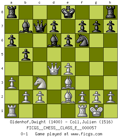 Last move : 0-1 2007 November 15 7:14:6 [Event "FICGS__CHESS__CLASS_E__000057"] [Site "FICGS"] [Date "2007.08.02"] [Round "1"] [White "Oldenhof,Dwight"] [Black "Coll,Julien"] [Result "0-1"] [WhiteElo "1400"] [BlackElo "1516"] 1.e4 c5 2.Nf3 e6 3.d4 cxd4 4.Nxd4 Nc6 5.Nc3 Qc7 6.a3 a6 7.Be3 Nf6 8.Bc4 b5 9.Be2 Bb7 10.O-O Nxd4 11.Qxd4 Bd6 0-1 Sicilian : Taimanov (Bastrikov) variation Kingside Castling by player White (move 10) Player Black won this chess game. Follow this game move after move (download)Do you realize Fischer almost never has any bad pieces? He exchanges them, and the bad pieces remain with his opponents. (Yuri Balashov) Die Elozahlen sind sehr schlecht für das Schach. Jetzt ist Schach eine Sportindustrie, die darauf zielt Elopunkte zu machen. (Miguel Najdorf) El Ajedrez hace al hombre ser mas sabio y ver mas claro. (Vladimir Putin) Lorsque vous vous retrouvez devant une position atroce, ne tendez pas un ultime piège dérisoire avec l'intention d'abandonner si l'adversaire le déjoue ! Faites-vous plutôt un devoir de résister comme si votre vie en dépendait. Jouez le coup qui vous déplairait au centuple si vous étiez dans la peau de votre tortionnaire ! Always two there are. No more no less. A master, and an apprentice. (Master Yoda in Star Wars ep.1)