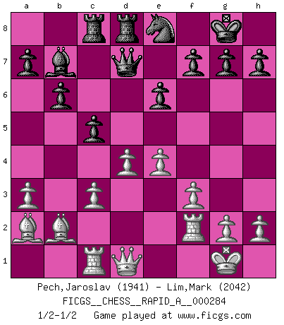 Last move : 1/2-1/2 2022 September 18 15:16:26 [Event "FICGS__CHESS__RAPID_A__000284"] [Site "FICGS"] [Date "2022.07.10"] [Round "1"] [White "Pech,Jaroslav"] [Black "Lim,Mark"] [Result "1/2-1/2"] [WhiteElo "1941"] [BlackElo "2042"] 1.d4 Nf6 2.c4 e6 3.Nc3 Bb4 4.e3 O-O 5.Bd3 d5 6.Nf3 b6 7.O-O dxc4 8.Bxc4 c5 9.a3 Bxc3 10.bxc3 Qc7 11.Ba2 Bb7 12.Ne5 Nbd7 13.Nxd7 Qxd7 14.f3 Rfd8 15.Bb2 Rac8 16.e4 Ne8 17.Rc1 Qb5 18.Rf2 Qd7 1/2-1/2 Nimzo-Indian : 4.e3 O-O, 5.Bd3 d5 Kingside Castling by player Black (move 4) Kingside Castling by player White (move 7) This chess game ended in a draw. Follow this game move after move (download)Everything is in a state of flux, and this includes the world of Chess. (Mikhail Botvinnik) Ich spiele 70 Eröffnungssysteme. (Viktor Kortschnoi) Una partida de Ajedrez se divide en 3 etapas: la primera cuando piensas que tienes la ventaja, la segunda cuando crees que tienes la ventaja y la tercera... ¡cuando te das cuenta que vas a perder!. (Savielly Tartakower) Les pièces de l'échiquier étaient impitoyables. Elles le retenaient, elles l'absorbaient. Il y avait de l'horreur en cela, mais aussi une harmonie unique. Car, qu'y a-t-il dans le monde, à part les échecs ? (V. Nabokov) Perhaps chess is the wrong game for the times (The Chess Master and the Computer, by Garry Kasparov - 2010)