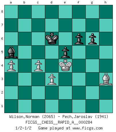 Last move : 1/2-1/2 2022 November 11 7:30:33 [Event "FICGS__CHESS__RAPID_A__000284"] [Site "FICGS"] [Date "2022.07.10"] [Round "1"] [White "Wilson,Norman"] [Black "Pech,Jaroslav"] [Result "1/2-1/2"] [WhiteElo "2065"] [BlackElo "1941"] 1.e4 c5 2.Nf3 Nc6 3.Bb5 d6 4.O-O Bd7 5.c3 Nf6 6.Re1 a6 7.Bf1 Bg4 8.d3 e6 9.h3 Bh5 10.g4 Bg6 11.Nh4 Nd7 12.Ng2 e5 13.Nd2 h5 14.Nf3 hxg4 15.hxg4 b5 16.Ne3 Be7 17.Bg2 Rc8 18.Nf5 Kf8 19.Be3 Bxf5 20.gxf5 Nf6 21.Kf1 Kg8 22.Ke2 b4 23.Nd2 Nh5 24.Rh1 Bg5 25.Ke1 Nf4 26.Rxh8+ Kxh8 27.Bf1 Kg8 28.Qg4 Rb8 29.a3 bxc3 30.bxc3 Bh6 31.Rb1 Rxb1+ 32.Nxb1 Qb8 33.Qd1 Qb6 34.Qc2 d5 35.exd5 Ne7 36.Nd2 Nexd5 37.Qb3 Qxb3 38.Nxb3 Nxe3 39.fxe3 Nd5 40.c4 Nxe3 41.Nxc5 Nxf5 42.Nxa6 Nd4 43.a4 Kf8 44.Bh3 Ke7 45.Nb4 Nb3 46.Kd1 Kd6 47.Kc2 Na5 48.Nd5 Nc6 49.Kc3 Bg5 50.Nb4 Bh4 51.Nxc6 Be1+ 52.Kc2 Kxc6 53.Kd1 Ba5 54.Ke2 Kd6 55.Ke3 Bb6+ 56.Ke4 g6 57.Bc8 f6 58.Bh3 Ba5 1/2-1/2 Sicilian : Nimzovich-Rossolimo attack (without ...d6) Kingside Castling by player White (move 4) 10 pieces endgame at move 52 : White KBPPP , Black KBPPP WHITE : King + 1 Bishop 3 Pawns BLACK : King + 1 Bishop 3 Pawns This chess game ended in a draw. Follow this game move after move (download)Chess is a fairy tale of 1001 blunders. (Savielly Tartakower) Im Schach nämlich geht es darum, daß Ich des Gegners klein zu kriegen, sein Ego zu zerbrechen und zu zermahlen, seine Selbstachtung zu zertreten und zu verscharren und seine ganze mißachtenswerte sogenannte Persönlichkeit ein für alle Mal tot zu hacken und zu zerstampfen und dadurch die menschliche Gesellschaft von einer stinkenden Pestbeule zu befreien. Es ist ein königliches Spiel. (Robert James Fischer) La enorme capacidad mental, en la que sin ella no puede un jugador de Ajedrez existir, es demasiado requerida por el Ajedrez al grado de que nunca podrá liberar su mente de este juego. (Albert Einstein) Votre seul travail dans les ouvertures est d'obtenir un milieu de partie jouable. (Lajos Portish) There is a computer disease that anybody who works with computers knows about. It's a very serious disease and it interferes completely with the work. The trouble with computers is that you 'play' with them ! (Richard P. Feynman)