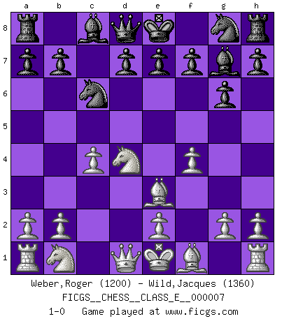 Last move : 1-0 2006 September 21 8:14:56 [Event "FICGS__CHESS__CLASS_E__000007"] [Site "FICGS"] [Date "2006.06.27"] [Round "1"] [White "Weber,Roger"] [Black "Wild,Jacques"] [Result "1-0"] [WhiteElo "1200"] [BlackElo "1360"] 1.c4 c5 2.f4 Nc6 3.Nf3 g6 4.d4 cxd4 5.Nxd4 Bg7 6.Be3 1-0 This chess game has been lost on time (started : 2006.06.27 19:4:46) English : Symmetrical variation Player White won this chess game. Follow this game move after move (download)Adequate compensation for a sacrifice is having a sound combination leading to a winning position; adequate compensation for a blunder is having your opponent snatch defeat from the jaws of victory. (Bruce A. Moon) Kasparov stellt für gewöhnlich die Regeln auf und bricht sie dann selbst wieder. (Alexej Shirov) Después de la respuesta de las negras a 1.e4 con 1..e5, se quedan siempre tratando de entrar dentro del juego. (Howard Staunton) Le joueur d'Echecs qui veut atteindre le top est obligé de développer son propre credo créatif. Alexeï Stepanovicth Souétine. Il est facile d'écrire des livres ! Ce qui est difficile, c'est de jouer ! (Alexeï Stepanovicth Souétine) Whatever you do, don't be bored. This is absolutely the most exciting time we could have possibly hoped to be alive. And things are just starting. (From movie Waking life)