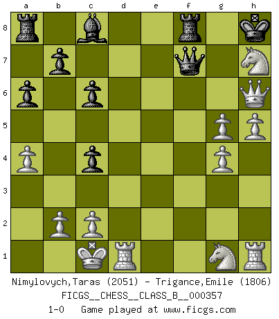 Last move : 1-0 2022 October 20 11:3:17 [Event "FICGS__CHESS__CLASS_B__000357"] [Site "FICGS"] [Date "2022.07.12"] [Round "1"] [White "Nimylovych,Taras"] [Black "Trigance,Emile"] [Result "1-0"] [WhiteElo "2051"] [BlackElo "1806"] 1.e4 d6 2.d4 Nf6 3.Nc3 g6 4.Be3 Bg7 5.f3 Nbd7 6.Qd2 a6 7.g4 Nb6 8.a4 d5 9.e5 Nfd7 10.O-O-O Nc4 11.Bxc4 dxc4 12.Bh6 O-O 13.h4 c6 14.h5 Bxh6 15.Qxh6 g5 16.f4 Nxe5 17.dxe5 Qe8 18.Ne4 f6 19.fxg5 Qf7 20.exf6 exf6 21.Nxf6+ Kh8 22.Nxh7 1-0 Pirc defense Queenside Castling by player White (move 10) Kingside Castling by player Black (move 12) Player White won this chess game. Follow this game move after move (download)We cannot resist the fascination of sacrifice, since a passion for sacrifices is part of a Chessplayer's nature. (Rudolf Spielman) Viele Opfer benötigen überhaupt keine konkrete Berechnung. Es genügt sich die entstehende Position kurz vorzustellen, um uns davon zu überzeugen, dass das Opfer korrekt ist. (Mikhail Nekhemyevich Tal) Si pudieramos observar el interior de la cabeza de un jugador de Ajedrez, encontraríamos ahí un mundo lleno de sentimientos, imágenes, ideas, emoción y pasión. (Alfred Binet) Il n'y a pas de prix trop élevé au scalp de l'ennemi. (Koblentz) The only thing that matters is the evidence. (Horatio Caine, C.S.I. Miami)