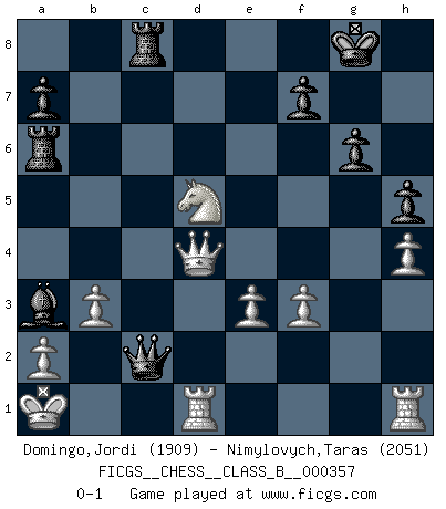 Last move : 0-1 2023 January 26 23:13:56 [Event "FICGS__CHESS__CLASS_B__000357"] [Site "FICGS"] [Date "2022.07.12"] [Round "1"] [White "Domingo,Jordi"] [Black "Nimylovych,Taras"] [Result "0-1"] [WhiteElo "1909"] [BlackElo "2051"] 1.g4 d5 2.Bg2 Bxg4 3.c4 c6 4.Qb3 e6 5.Qxb7 Nd7 6.Nc3 Ne7 7.cxd5 exd5 8.d4 Rb8 9.Qa6 Rb6 10.Qd3 Ng6 11.h3 Be6 12.Nf3 Bd6 13.h4 h5 14.Ng5 Bg4 15.b3 Nf6 16.Bd2 O-O 17.O-O-O Nf4 18.Bxf4 Bxf4+ 19.Kb2 Qe7 20.Rde1 g6 21.e3 Bd6 22.Bh3 Bxh3 23.Nxh3 c5 24.dxc5 Bxc5 25.Nf4 Rc8 26.Kb1 Qe5 27.f3 Bb4 28.Ncxd5 Nxd5 29.Qxd5 Qf6 30.Rd1 Ba3 31.Qd4 Qc6 32.Nd5 Qc2+ 33.Ka1 Ra6 0-1 Grob : Fritz gambit Kingside Castling by player Black (move 16) Queenside Castling by player White (move 17) Player Black won this chess game. Follow this game move after move (download)It is no time to be playing Chess when the house is on fire. (Italian Proverb) Ich hatte Zahnschmerzen im ersten Spiel. In der zweiten Partie tat mir der Kopf weh. In der dritten war es eine Rheuma-Attacke und während der vierten fühlte ich mich nicht gut. Und in der fünften? Nun, man muss doch nicht jedes Spiel gewinnen, oder? (Savielly Grigorievitsch Tartakower) Cuando tu casa esta en llamas, no puedes ser molestado por tus vecinos. O, como decinos en Ajedrez, si tu Rey esta bajo ataque, no te preocupa perder un Peón del lado de la Reina. (Gary Kasparov) Les sacrifices démontrent seulement que quelqu'un a gaffé. (Savielly Tartacover) True nature is revealed in times of difficulty. (Chinese proverb)