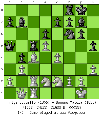 Last move : 1-0 2022 November 10 22:2:58 [Event "FICGS__CHESS__CLASS_B__000357"] [Site "FICGS"] [Date "2022.07.12"] [Round "1"] [White "Trigance,Emile"] [Black "Benone,Mateia"] [Result "1-0"] [WhiteElo "1806"] [BlackElo "1820"] 1.d4 Nf6 2.c4 c5 3.d5 b5 4.Qc2 Na6 5.Bd2 Nb4 6.Bxb4 cxb4 7.e4 Qa5 8.b3 bxc4 9.Bxc4 g6 10.Nd2 Bg7 11.Rc1 Bb7 12.Ne2 O-O 13.O-O Rac8 14.Qb1 d6 15.h3 h5 16.Rc2 Rc5 17.Rfc1 1-0 This chess game has been lost on time (started : 2022.07.12 0:26:39) Benko gambit Kingside Castling by player Black (move 12) Kingside Castling by player White (move 13) Player White won this chess game. Follow this game move after move (download)If you aren't afraid of Spassky, then I have removed the element of money. (Jim Slater) Wie gewinnt Tal? Er entwickelt alle seine Figuren in die Brettmitte und opfert sie dann irgendwo. (Robert James Fischer) Ayuda a tus piezas para que ellas te puedan ayudar. (Paul Morphy) Le jeu d'échecs fait naître et fortifie en nous plusieurs qualités précieuses dans le cours de l'existence, telles que la prévoyance, la circonspection, la prudence, et la persévérance. (Benjamin Franklin - 1783, la morale des échecs) The weakness of an artist is dogma. (Josh Waitzkin)