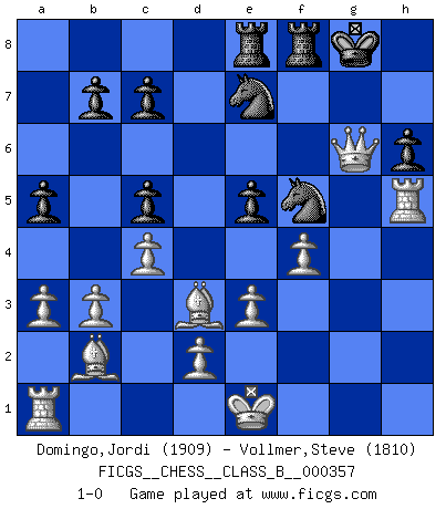 Last move : 1-0 2022 August 22 17:15:22 [Event "FICGS__CHESS__CLASS_B__000357"] [Site "FICGS"] [Date "2022.07.12"] [Round "1"] [White "Domingo,Jordi"] [Black "Vollmer,Steve"] [Result "1-0"] [WhiteElo "1909"] [BlackElo "1810"] 1.g4 e5 2.c4 Bc5 3.Nc3 d6 4.e3 Nc6 5.a3 a5 6.h4 f5 7.gxf5 Bxf5 8.Nge2 Qf6 9.Ng3 Nh6 10.Nce4 Qf7 11.Nxf5 Nxf5 12.b3 O-O 13.Qg4 h6 14.h5 Rae8 15.Bb2 g5 16.hxg6 Qg7 17.Bd3 Nce7 18.Nxc5 dxc5 19.Rh5 Qf6 20.f4 Qxg6 21.Qxg6+ 1-0 Grob's attack Kingside Castling by player Black (move 12) Player White won this chess game. Follow this game move after move (download)For me, Chess is life and every game is like a new life. Every Chess player gets to live many lives in one lifetime. (Eduard Gufeld) Spielt Blackmar-Diemer-Gambit, und das Matt kommt von selbst! (Emil Joseph Diemer) El jugador blanco perdió porque fallo en recordar la coreccta continuación y tuvo que pensar por sí mismo las movidas. (Siegbert Tarrasch) Le plus grand jeu de l'esprit jamais inventé, plus vous l'apprenez, plus vous y prenez du plaisir. (Garry Kasparov) Bobby never cared about money, though. His only desire was to prove that his choices were correct: He wanted chess to be important because he was a chess player, and he wanted to be important. Bobby knew money was important, but he didn't have a clue why, outside of clothes and status. The only way he could accomplish what he wanted was to fight for a lot of money. Once he got it, he gave it away. He did not know how to spend it. And once he'd become champion, after, essentially, sacrificing his life for it, he didn't know how to spend his time. (Bob Wade)