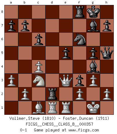 Last move : 0-1 2022 September 24 14:32:14 [Event "FICGS__CHESS__CLASS_B__000357"] [Site "FICGS"] [Date "2022.07.12"] [Round "1"] [White "Vollmer,Steve"] [Black "Foster,Duncan"] [Result "0-1"] [WhiteElo "1810"] [BlackElo "1911"] 1.c4 f5 2.Nf3 Nf6 3.Nc3 d6 4.d4 g6 5.g3 Bg7 6.Bg2 O-O 7.Qc2 c6 8.O-O Na6 9.Bd2 Qe8 10.a3 Nc7 11.Rad1 e5 12.dxe5 dxe5 13.e4 Ne6 14.Bc1 fxe4 15.Nd2 Nd4 16.Qb1 Bg4 17.Rde1 Nf3+ 18.Bxf3 exf3 19.Rd1 g5 20.Qd3 Qh5 21.Rfe1 Rad8 22.Qe3 Rxd2 0-1 English : Anglo-Dutch defense Kingside Castling by player Black (move 6) Kingside Castling by player White (move 8) Player Black won this chess game. Follow this game move after move (download)Blessed be the memory of him who gave the world this immortal game. (A. G. Gardiner) Ich verstehe den Grund nicht, warum die Aufteilung in Frauen und Männer überhaupt im Schach besteht. (Judith Polgar) Los tropiezos estan todos ahí en el tablero, esperando que se cometan. (Savielly Tartakover) Si je n'étais pas joueur d'échecs, je serais le meilleur dans quelque chose d'autre. (Anatoli Karpov) The message for business people contemplating their place in the cyberspace is simple and direct: get linked or get lost. (Vic Sussman and Kenan Pollack)
