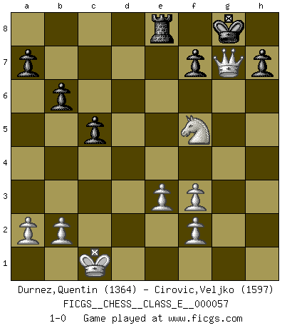 Last move : 1-0 2007 December 28 20:39:55 [Event "FICGS__CHESS__CLASS_E__000057"] [Site "FICGS"] [Date "2007.08.02"] [Round "1"] [White "Durnez,Quentin"] [Black "Cirovic,Veljko"] [Result "1-0"] [WhiteElo "1364"] [BlackElo "1597"] 1.d4 d5 2.c4 e6 3.Nc3 Bb4 4.Nf3 Nf6 5.Bd2 O-O 6.e3 Re8 7.Ne2 Bxd2+ 8.Qxd2 dxc4 9.Nf4 b6 10.Bxc4 Bb7 11.Be2 Ne4 12.Qc2 Ng5 13.O-O-O Bxf3 14.Bxf3 Nxf3 15.gxf3 Qe7 16.h4 Rc8 17.h5 Nd7 18.Rhg1 Nf6 19.Rg2 c5 20.d5 exd5 21.Rdg1 Kh8 22.Rxg7 Rg8 23.Nxd5 Rxg7 24.Rxg7 Kxg7 25.Nxe7 Nxh5 26.Qe4 Re8 27.Qe5+ Nf6 28.Nf5+ Kf8 29.Qxf6 Kg8 30.Qg7+ 1-0 QGD : 3.Nc3 Kingside Castling by player Black (move 5) Queenside Castling by player White (move 13) Player White won this chess game. Follow this game move after move (download)A player surprised is half beaten. (Proverb) Vom Schach wurde gesagt das Leben sei dafür nicht lange genug. Aber das ist der Fehler des Lebens, nicht des Schach'. (Irving Chernev) El Ajedrez era la lengua materna de Capablanca. (Reti) A chaque perte on perd un peu de soi. (Joël Lautier) Don't be irreplaceable, if you can't be replaced, you can't be promoted. (Dan Rotaru)
