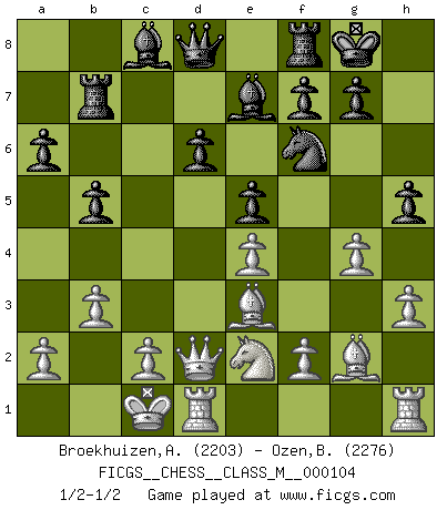 Last move : 1/2-1/2 2022 July 24 13:52:33 [Event "FICGS__CHESS__CLASS_M__000104"] [Site "FICGS"] [Date "2022.07.13"] [Round "1"] [White "Broekhuizen,A. T. S."] [Black "Ozen,Bahadir"] [Result "1/2-1/2"] [WhiteElo "2203"] [BlackElo "2276"] 1.e4 c5 2.Nf3 d6 3.d4 cxd4 4.Nxd4 Nf6 5.Nc3 a6 6.h3 e5 7.Nde2 h5 8.g3 Be7 9.Bg2 b5 10.Nd5 Nxd5 11.Qxd5 Ra7 12.Be3 Rb7 13.b3 Nd7 14.Qd2 Nf6 15.O-O-O O-O 16.g4 1/2-1/2 Sicilian : Najdorf, Adams attack Queenside Castling by player White (move 15) Kingside Castling by player Black (move 15) This chess game ended in a draw. Follow this game move after move (download)The boy (then a 12 year old boy named Anatoly Karpov) doesn't have a clue about Chess, and there's no future at all for him in this profession. (Mikhail Botvinnik) Jeder Fehler erscheint unglaublich dumm, wenn andre ihn begehen. (Georg Christoph Lichtenberg) Tu eres para mi la Reina en d8 y yo soy el Peón en d7!!. (GM Eduard Gufeld) Vous savez, camarade Pachman, je n'éprouve pas de plaisir à être ministre, je jouerais plutôt aux échecs comme vous, ou alors ferais une révolution au Venezuela. (Che Guevara à Ludek Pachman, 'Checkmate in Prague', 1975) You must do what you feel is right... of course. (Obi-Wan Kenobi in Star Wars ep.4)