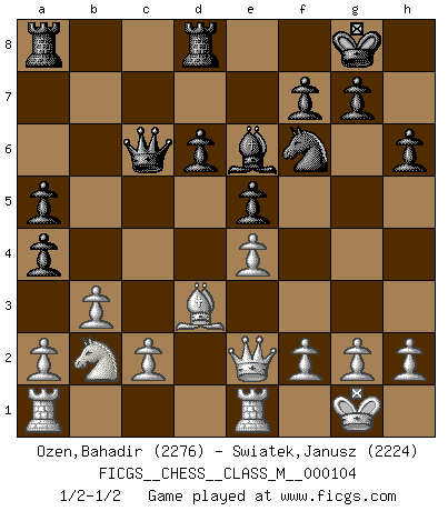 Last move : 1/2-1/2 2022 August 12 6:38:2 [Event "FICGS__CHESS__CLASS_M__000104"] [Site "FICGS"] [Date "2022.07.13"] [Round "1"] [White "Ozen,Bahadir"] [Black "Swiatek,Janusz"] [Result "1/2-1/2"] [WhiteElo "2276"] [BlackElo "2224"] 1.e4 c5 2.Nf3 d6 3.d4 Nf6 4.Nc3 cxd4 5.Nxd4 a6 6.Be3 e5 7.Nf3 Be7 8.Bc4 O-O 9.O-O Nc6 10.Qe2 Na5 11.Bd3 Be6 12.Na4 b5 13.Bb6 Qc8 14.Bxa5 bxa4 15.b3 h6 16.Rfe1 Bd8 17.Bxd8 Rxd8 18.Nd2 a5 19.Nc4 Qc6 20.Nb2 1/2-1/2 Sicilian Kingside Castling by player Black (move 8) Kingside Castling by player White (move 9) This chess game ended in a draw. Follow this game move after move (download)It's always better to sacrifice your opponent's men. (Savielly Tartakover) Du musst Deinen Gegner in einen tiefen dunklen Wald führen wo 2+2=5 ist und wo der Weg, der wieder hinausführt, nur breit genug für einen ist. (Mikhail Nekhemyevich Tal) Yo jugué Ajedrez con el y a veces le pude haber ganado solo que siempre devuelve su última jugada y juega la partida de manera diferente. (Mark Twain) Il n'y a plus de joueurs du niveau de Jacob Murray dont la seule quête est le beau jeu, le plaisir de voir les pièces construire quelque chose. Sur 10 idées à la minute, 9 seront sans intérêt, la dernière s'avèrera géniale. (Christian Bauer) Men never do evil so completely and cheerfully as when they do it from religious conviction. (Blaise Pascal)