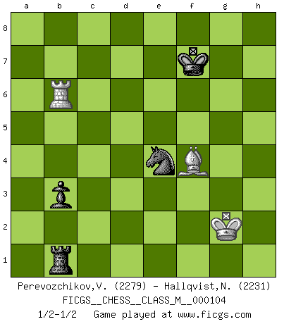 Last move : 1/2-1/2 2022 October 1 12:19:52 [Event "FICGS__CHESS__CLASS_M__000104"] [Site "FICGS"] [Date "2022.07.13"] [Round "1"] [White "Perevozchikov,Vjacheslav"] [Black "Hallqvist,Niklas"] [Result "1/2-1/2"] [WhiteElo "2279"] [BlackElo "2231"] 1.Nc3 c5 2.d4 cxd4 3.Qxd4 Nc6 4.Qd3 a6 5.e4 b5 6.Qg3 d6 7.Be3 g6 8.Nf3 Bg7 9.Bd3 Nf6 10.O-O O-O 11.a3 Rb8 12.Rad1 Bd7 13.h3 Nh5 14.Qh4 h6 15.Nd5 e6 16.Qxd8 Rfxd8 17.Nb4 Nxb4 18.axb4 Bxb2 19.Bxh6 Bc6 20.g4 Nf6 21.Rb1 Bc3 22.Rb3 Bxe4 23.Rxc3 Bxf3 24.Bxg6 Bxg4 25.hxg4 fxg6 26.Re1 Re8 27.Rc6 Nxg4 28.Bf4 Rbc8 29.Rxd6 Rxc2 30.Bg3 Rb2 31.Rxa6 Rxb4 32.Raxe6 Rxe6 33.Rxe6 Kf7 34.Rd6 Nf6 35.Be5 Ng4 36.Bg3 g5 37.Kg2 Rb3 38.Rc6 b4 39.Rd6 Rb2 40.Kf3 Nf6 41.Be5 Rb3+ 42.Kg2 Ne4 43.Rb6 Rb1 44.f4 gxf4 45.Bxf4 b3 1/2-1/2 Dunst (Sleipner, Heinrichsen) Opening Kingside Castling by player White (move 10) Kingside Castling by player Black (move 10) 10 pieces endgame at move 32 : White KRBP , Black KRRNPP WHITE : King + 1 Rook 1 Bishop 1 Pawn BLACK : King + 2 Rooks 1 Knight 2 Pawns 9 pieces endgame at move 33 : White KRBP , Black KRNPP WHITE : King + 1 Rook 1 Bishop 1 Pawn BLACK : King + 1 Rook 1 Knight 2 Pawns 8 pieces endgame at move 44 : White KRB , Black KRNPP WHITE : King + 1 Rook 1 Bishop BLACK : King + 1 Rook 1 Knight 2 Pawns 7 pieces endgame at move 45 : White KRB , Black KRNP WHITE : King + 1 Rook 1 Bishop BLACK : King + 1 Rook 1 Knight 1 Pawn This chess game ended in a draw. Follow this game move after move (download)When I asked Fischer why he had not played a certain move in our game, he replied: 'Well, you laughed when I wrote it down !' (Mikhail Tal) Wer sich die Fähigkeit anerziehen will im Schach selbstständig zu denken, der muß alles meiden, was leblos ist: ausgeklügelte Theorien, die sich auf sehr wenige Beispiele und eine Menge Hirngespinste stützen. (Emanuel Lasker) No existe un remordimiento como el remordimiento del Ajedrez. (H. G. Wells) J'ai vu le vaincu d'Echecs jouer des années durant dans l'espoir de la fête de la victoire. Car tu es plus riche de ce qu'elle existe si même elle n'est point pour toi. Ainsi de la perle du fond des mers. (Antoine de Saint-Exupéry) There is a computer disease that anybody who works with computers knows about. It's a very serious disease and it interferes completely with the work. The trouble with computers is that you 'play' with them ! (Richard P. Feynman)
