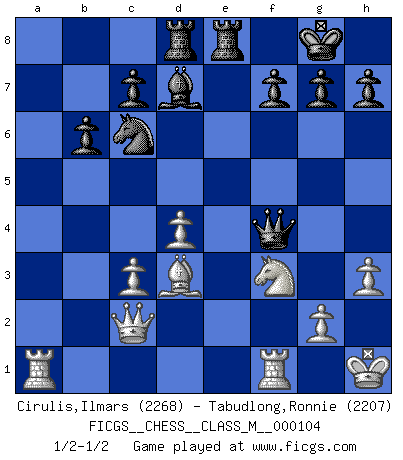 Last move : 1/2-1/2 2022 August 2 16:17:7 [Event "FICGS__CHESS__CLASS_M__000104"] [Site "FICGS"] [Date "2022.07.13"] [Round "1"] [White "Cirulis,Ilmars"] [Black "Tabudlong,Ronnie"] [Result "1/2-1/2"] [WhiteElo "2268"] [BlackElo "2207"] 1.c4 e5 2.Nc3 Nf6 3.Nf3 Nc6 4.d3 d5 5.cxd5 Nxd5 6.e4 Nxc3 7.bxc3 Bc5 8.Be2 O-O 9.O-O Qe7 10.h3 Be6 11.a4 Rad8 12.a5 b5 13.axb6 axb6 14.Be3 Bxe3 15.fxe3 Bd7 16.Qc2 Rfe8 17.d4 exd4 18.exd4 Qxe4 19.Bd3 Qe3+ 20.Kh1 Qh6 21.Qf2 Qf4 22.Qc2 Qh6 23.Qf2 Qf4 24.Qc2 1/2-1/2 English Opening Kingside Castling by player Black (move 8) Kingside Castling by player White (move 9) This chess game ended in a draw. Follow this game move after move (download)Fischer prefers to enter Chess history alone. (Miguel Najdorf) Am wohlsten fühle ich mich, wenn ich sehe, wie sich mein Gegner im Todeskampf windet. (Robert James Fischer) El muchacho (en ese entonces un niño de 12 años llamado Anatoly Karpov) no tiene ni idea de lo que es el Ajedrez y no hay futuro en absoluto para el en esta profesión. (Mikhail Botvinnik) Avant la finale, les dieux ont créé le milieu de partie. (Tarrasch) No, no, you're not thinking; you're just being logical. (Niels Bohr)