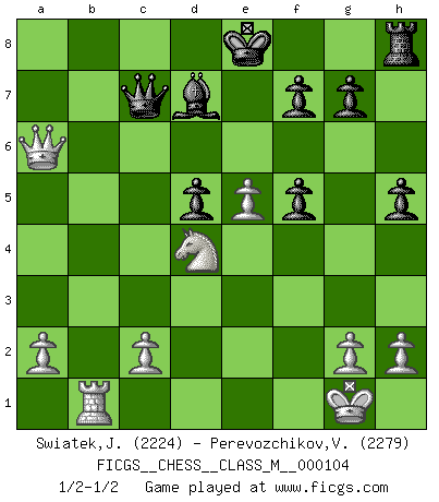 Last move : 1/2-1/2 2022 September 6 23:0:49 [Event "FICGS__CHESS__CLASS_M__000104"] [Site "FICGS"] [Date "2022.07.13"] [Round "1"] [White "Swiatek,Janusz"] [Black "Perevozchikov,Vjacheslav"] [Result "1/2-1/2"] [WhiteElo "2224"] [BlackElo "2279"] 1.d4 e6 2.e4 d5 3.Nc3 Nf6 4.e5 Nfd7 5.f4 c5 6.Nf3 Nc6 7.Be3 cxd4 8.Nxd4 Qb6 9.Qd2 Qxb2 10.Rb1 Qa3 11.Bb5 Nxd4 12.Bxd4 a6 13.Bxd7+ Bxd7 14.Rb3 Qe7 15.Rxb7 Rc8 16.O-O Qd8 17.f5 exf5 18.Bb6 Bc5+ 19.Bxc5 Rxc5 20.Qe3 Qc8 21.Rb8 Qxb8 22.Qxc5 Qc8 23.Qa3 Be6 24.Rb1 Qc7 25.Ne2 h5 26.Nd4 Bc8 27.Qa4+ Bd7 28.Qxa6 1/2-1/2 Queen's pawn Kingside Castling by player White (move 16) This chess game ended in a draw. Follow this game move after move (download)The tactician knows what to do when there is something to do; whereas the strategian knows what to do when there is nothing to do. (Gerald Abrahams) Das Schachspiel übertrifft alle anderen Spiele so weit wie der Chimborasso einen Misthaufen. (Arthur Schopenhauer) En un gambito tu regalas un Peón por el bién de tomar un juego perdido. (Samuel Standige Boden) Ne tendez aucun piège pour le plaisir ! Ne jouez rien dans l'espoir que l'adversaire réagisse de façon stupide ! Prenez toujours pour acquis que l'adversaire va trouver le meilleur coup ! Ne jouez jamais de coup dans l'espoir que l'adversaire ne voie pas la menace ! Chacun de vos coups doit améliorer la position d'une façon ou d'une autre. Somewhere in the world there is an epigram for every dilemma. (Hendrik Willem van Loon)