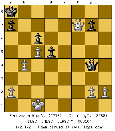 Last move : 1/2-1/2 2022 August 27 11:47:23 [Event "FICGS__CHESS__CLASS_M__000104"] [Site "FICGS"] [Date "2022.07.13"] [Round "1"] [White "Perevozchikov,Vjacheslav"] [Black "Cirulis,Ilmars"] [Result "1/2-1/2"] [WhiteElo "2279"] [BlackElo "2268"] 1.Nc3 f5 2.e4 fxe4 3.Nxe4 Nc6 4.d4 Nf6 5.Nxf6+ exf6 6.d5 Ne5 7.f4 Nf7 8.Bd3 b6 9.Bd2 Bb7 10.c4 Bc5 11.Ne2 Qe7 12.Qc2 O-O-O 13.O-O-O Kb8 14.Rhe1 Bf2 15.Rf1 Be3 16.Nc3 Bxd2+ 17.Rxd2 c6 18.Re2 Qc5 19.Na4 Qf8 20.c5 b5 21.d6 bxa4 22.Re7 Re8 23.Rfe1 Rxe7 24.dxe7 Qe8 25.Qxa4 d5 26.Qc2 Bc8 27.Bxh7 Ne5 28.fxe5 Qxe7 29.e6 Bxe6 30.Bd3 Rh5 31.Qc3 Kb7 32.b4 Qd7 33.Qa3 Re5 34.Ba6+ Ka8 35.Rxe5 fxe5 36.Qc3 Qc7 37.Qg3 Bc8 38.Bxc8 Qxc8 39.Qxe5 Qg4 40.Qe8+ Kb7 41.Qf7+ Ka8 1/2-1/2 Dunst (Sleipner, Heinrichsen) Opening Queenside Castling by player Black (move 12) Queenside Castling by player White (move 13) This chess game ended in a draw. Follow this game move after move (download)Chess is the gymnasium of the mind. (Blaise Pascal) Gott hat gewollt, dass ich Champion werde. (Surab Azmajparaschvili) Nunca nadie ha ganado una partida de Ajedrez rindiendose. (Unknown) L'ordinateur a tué l'originalité. Il n'y a plus guère d'aventures sur l'échiquier. (Jacob Murray) Either move or be moved. (Ezra Pound)