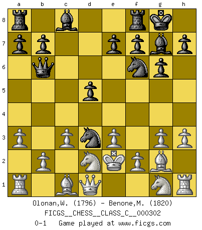 Last move : 0-1 2022 November 12 13:54:45 [Event "FICGS__CHESS__CLASS_C__000302"] [Site "FICGS"] [Date "2022.07.14"] [Round "1"] [White "Olonan,Wilfredo Olanka"] [Black "Benone,Mateia"] [Result "0-1"] [WhiteElo "1796"] [BlackElo "1820"] 1.d4 Nf6 2.h3 d5 3.a3 g6 4.g3 Bg7 5.e3 O-O 6.Bg2 c5 7.dxc5 Nbd7 8.c3 Nxc5 9.Nd2 Nd3+ 10.Ke2 Qb6 0-1 This chess game has been lost on time (started : 2022.07.14 16:12:36) Queen's pawn game Kingside Castling by player Black (move 5) Player Black won this chess game. Follow this game move after move (download)No one ever won a game by resigning. (Unknown) Ich bin Weltmeister und muß mit niemandem irgend etwas diskutieren. (Viswanathan Anand) A través de las casillas del tablero, los Indios explican el movimiento del tiempo y la edad, las influencias mas altas que controlan el mundo y los lazos que vinculan al Ajedrez con el alma humana. (Al-Masudi) Les sacrifices démontrent seulement que quelqu'un a gaffé. (Savielly Tartacover) War is the child of passion, passion is the child of narcissism and narcissism is the child. (...) Another game ? (Thibault de Vassal)
