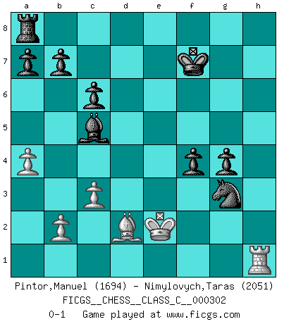 Last move : 0-1 2022 September 5 0:57:22 [Event "FICGS__CHESS__CLASS_C__000302"] [Site "FICGS"] [Date "2022.07.14"] [Round "1"] [White "Pintor,Manuel"] [Black "Nimylovych,Taras"] [Result "0-1"] [WhiteElo "1694"] [BlackElo "2051"] 1.e4 e5 2.f4 exf4 3.Nf3 d6 4.Bc4 h6 5.d4 g5 6.O-O Bg7 7.c3 Nf6 8.Qb3 O-O 9.e5 dxe5 10.Nxe5 Qe8 11.Nxf7 Rxf7 12.Nd2 c6 13.Bxf7+ Qxf7 14.Qxf7+ Kxf7 15.Nf3 Nh5 16.h4 Bf6 17.hxg5 hxg5 18.g4 Bxg4 19.Bd2 Nd7 20.Kg2 Be6 21.a4 g4 22.Ne5+ Nxe5 23.dxe5 Bxe5 24.Rae1 Bd6 25.Rh1 Bd5+ 26.Kf2 Bc5+ 27.Ke2 Bxh1 28.Rxh1 Ng3+ 0-1 KGA : Fischer defense Kingside Castling by player White (move 6) Kingside Castling by player Black (move 8) Player Black won this chess game. Follow this game move after move (download)The passed Pawn is a criminal, who should be kept under lock and key. Mild measures, such as police surveillance, are not sufficient. (Aaron Nimzovich) Pläne sind die Träume des Verständigen. (Ernst Freiherr von Feuchtersleben) Haz el enroque temprano y seguido. (Rob Sillars) On a dit que l'homme se distingue de l'animal par le fait qu'il achète plus de livres qu'il ne peut en lire. Je voudrais suggérer qu'inclure à la liste des livres quelques livres d'échecs rendrait la distinction manifeste. (Edward Lasker) Programming can only do so much before it becomes too much. (Don Groves)