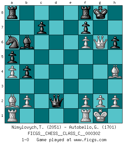 Last move : 1-0 2022 November 4 20:51:18 [Event "FICGS__CHESS__CLASS_C__000302"] [Site "FICGS"] [Date "2022.07.14"] [Round "1"] [White "Nimylovych,Taras"] [Black "Autobello,Giovanni"] [Result "1-0"] [WhiteElo "2051"] [BlackElo "1701"] 1.e4 e5 2.Nf3 Nc6 3.Bb5 a6 4.Ba4 Nf6 5.O-O b5 6.Bb3 Bc5 7.a4 Bb7 8.d3 O-O 9.Bg5 b4 10.Nbd2 d6 11.c3 h6 12.Bh4 a5 13.Ba2 Nb8 14.d4 exd4 15.cxd4 Bb6 16.e5 dxe5 17.dxe5 Bxf3 18.Qxf3 Qxd2 19.exf6 Na6 20.Qg4 g6 21.Qxg6+ 1-0 Ruy Lopez : 5.O-O Kingside Castling by player White (move 5) Kingside Castling by player Black (move 8) Player White won this chess game. Follow this game move after move (download)We must make sure that Chess will not be like a dead language, very interesting, but for a very small group. (Sytze Faber) Frage: Gibt es etwas was Sie mehr lieben als Autobahnen ohne Tempobegrenzungen? - Antwort: Deutsche Frauen ohne Tempobegrenzungen. (Loek van Wely) Uno por uno, yo los acribillé, mi superioridad muy pronto se volvio aparente. (Jose Capablanca) Mais n'est-ce pas déjà le limiter injurieusement que d'appeler les échecs un jeu? N'est-ce pas aussi une science, un art, ou quelque chose qui, comme le cercueil de Mahomet entre ciel et terre, est suspendu entre l'un et l'autre, et qui réunit un nombre incroyable de contraires ? (Stefan Zweig) To err is human, but to really foul things up requires a computer. (Farmer's Almanac, 1978)