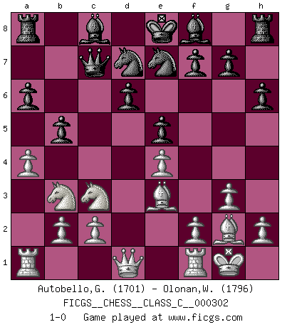 Last move : 1-0 2022 December 12 2:1:16 [Event "FICGS__CHESS__CLASS_C__000302"] [Site "FICGS"] [Date "2022.07.14"] [Round "1"] [White "Autobello,Giovanni"] [Black "Olonan,Wilfredo Olanka"] [Result "1-0"] [WhiteElo "1701"] [BlackElo "1796"] 1.e4 c5 2.Nf3 a6 3.d4 cxd4 4.Nxd4 h6 5.g3 e5 6.Nb3 d6 7.Bg2 Nd7 8.O-O Qc7 9.Nc3 Ne7 10.Be3 b5 11.a4 1-0 This chess game has been lost on time (started : 2022.07.14 16:12:36) Sicilian : O'Kelly variation Kingside Castling by player White (move 8) Player White won this chess game. Follow this game move after move (download)Chess, like any creative activity, can exist only through the combined efforts of those who have creative talent, and those who have the ability to organize their creative work. (Mikhail Botvinnik) Frage des Reporters: -Worin besteht das Ziel von Gambiteröffnungen? Antwort: -Auf Kosten der Partie einen Ruf als Angriffspieler zu erwerben.- (Siegbert Tarrasch) El Ajedrez es el arte del análisis. (Mikhail Botvinnik) Pour se monter efficace, un Cavalier a besoin d'avant-postes ! Les Cavaliers font les meilleurs bloqueurs de pions passés. It's not enough to succeed. Others must fail. (Gore Vidal)