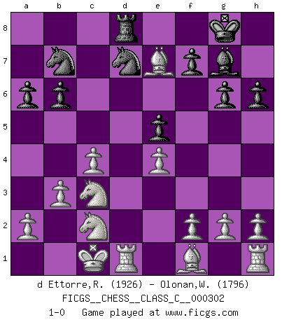 Last move : 1-0 2022 October 7 14:46:56 [Event "FICGS__CHESS__CLASS_C__000302"] [Site "FICGS"] [Date "2022.07.14"] [Round "1"] [White "d Ettorre,Rodolfo"] [Black "Olonan,Wilfredo Olanka"] [Result "1-0"] [WhiteElo "1926"] [BlackElo "1796"] 1.e4 c5 2.Nf3 a6 3.c4 h6 4.d4 cxd4 5.Nxd4 e5 6.Nf5 d6 7.Nc3 g6 8.Ne3 Bg7 9.Nc2 Nd7 10.Qxd6 Qe7 11.Qc7 Ngf6 12.b3 b6 13.Ba3 Nc5 14.Qc6+ Nfd7 15.Qxa8 O-O 16.Qd5 Rd8 17.O-O-O Bb7 18.Qxb7 Nxb7 19.Bxe7 1-0 This chess game has been lost on time (started : 2022.07.14 16:12:36) Sicilian : O'Kelly variation Kingside Castling by player Black (move 15) Queenside Castling by player White (move 17) Player White won this chess game. Follow this game move after move (download)It is no time to be playing Chess when the house is on fire. (Italian Proverb) Ein Teil des Fehlers ist immer korrekt. (Savielly Grigorievitsch Tartakower) Yo no creo en la psicología. Yo creo en las buenas movidas. (Bobby Fischer) Donnez-moi un Cavalier en 6e et je gagnerais toutes mes parties. (Steinitz) He who is a good ruler must first have been ruled. (Aristotle)