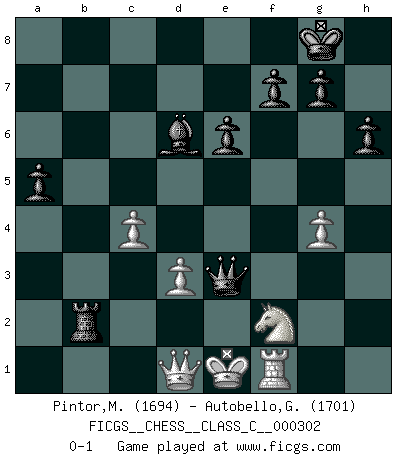 Last move : 0-1 2022 December 8 19:53:44 [Event "FICGS__CHESS__CLASS_C__000302"] [Site "FICGS"] [Date "2022.07.14"] [Round "1"] [White "Pintor,Manuel"] [Black "Autobello,Giovanni"] [Result "0-1"] [WhiteElo "1694"] [BlackElo "1701"] 1.e4 c5 2.f4 Nc6 3.Nf3 d6 4.Bc4 e6 5.c3 Nf6 6.d3 Be7 7.O-O Qc7 8.Ng5 O-O 9.Bb3 h6 10.Nh3 Re8 11.Nd2 b5 12.a3 a5 13.Nf3 b4 14.axb4 cxb4 15.Ba4 Bd7 16.Bxc6 Bxc6 17.Nd4 bxc3 18.bxc3 Reb8 19.Nxc6 Qxc6 20.c4 Qb6+ 21.Kh1 Qd4 22.Ba3 Rb6 23.Ra2 Rab8 24.e5 Ne8 25.g4 Rb3 26.Nf2 Qxf4 27.exd6 Nxd6 28.Bxd6 Bxd6 29.Kg2 Qxh2+ 30.Kf3 Qg3+ 31.Ke2 Rb2+ 32.Rxb2 Rxb2+ 33.Ke1 Qe3+ 0-1 Sicilian : Grand Prix attack Kingside Castling by player White (move 7) Kingside Castling by player Black (move 8) Player Black won this chess game. Follow this game move after move (download)One doesn't have to play well, it's enough to play better than your opponent. (Siegbert Tarrasch) Ich verlor meine Bürgerrechte, mein Gehalt wurde mir nicht mehr bezahlt und ich wurde zensiert und durfte nicht mehr ins Ausland reisen. [nach dem Match Fischer-Taimanov 6:0] (Mark Taimanov) Evita las multitudes. Haz independientemente tu propio razonamiento. Trata de ser el jugador de Ajedrez, no la pieza de Ajedrez. (Ralph Charell) Celui qui prend des risques peut perdre, celui qui n'en prend pas perd toujours. (Xavier Tartacover) A good programmer is someone who always looks both ways before crossing a one-way street. (Doug Linder)