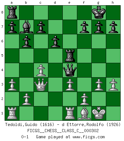 Last move : 0-1 2022 September 15 11:3:28 [Event "FICGS__CHESS__CLASS_C__000302"] [Site "FICGS"] [Date "2022.07.14"] [Round "1"] [White "Tedoldi,Guido"] [Black "d Ettorre,Rodolfo"] [Result "0-1"] [WhiteElo "1616"] [BlackElo "1926"] 1.c4 Nf6 2.Nc3 e5 3.d3 Bb4 4.Bd2 O-O 5.Nf3 Re8 6.a3 Bxc3 7.Bxc3 e4 8.dxe4 Nxe4 9.Qc2 Nxc3 10.Qxc3 Nc6 11.e3 d6 12.h3 b6 13.Bd3 Bb7 14.O-O Ne5 15.Nxe5 Rxe5 16.Rfe1 Qg5 17.Bf1 Qg6 18.g3 Qe4 0-1 English Opening Kingside Castling by player Black (move 4) Kingside Castling by player White (move 14) Player Black won this chess game. Follow this game move after move (download)When your house is on fire, you can't be bothered with the neighbors. Or, as we say in Chess, if your King is under attack you don't worry about losing a Pawn on the Queen's side. (Gary Kasparov) Wenn du auf das Glück wartest, wird das Leben ziemlich langweilig. (Mikhail Nekhemyevich Tal) Los finales de Peón son del Ajedrez lo que el cesped es del Golf. (Cecil Purdy) Toute estimation doit être constamment réévaluée. (Jacob Estrin) In theory there is no difference between theory and practice. In practice there is. (Yogi Berra)