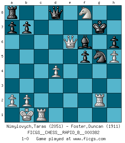 Last move : 1-0 2022 November 14 6:42:12 [Event "FICGS__CHESS__RAPID_B__000382"] [Site "FICGS"] [Date "2022.07.14"] [Round "1"] [White "Nimylovych,Taras"] [Black "Foster,Duncan"] [Result "1-0"] [WhiteElo "2051"] [BlackElo "1911"] 1.e4 c6 2.d4 d5 3.Nc3 dxe4 4.Nxe4 Bf5 5.Ng3 Bg6 6.h4 h6 7.Nf3 Nd7 8.h5 Bh7 9.Bd3 Bxd3 10.Qxd3 e6 11.Bd2 Ngf6 12.O-O-O Be7 13.Ne4 O-O 14.Nxf6+ Nxf6 15.Kb1 c5 16.g4 Nxg4 17.Qe2 cxd4 18.Rhg1 d3 19.cxd3 f5 20.Qxe6+ Kh8 21.d4 Bf6 22.Rc1 Nxf2 23.Rg2 Ne4 24.Bxh6 gxh6 25.Nh4 Ng5 26.Ng6+ Kg7 27.Nxf8 1-0 This chess game has been lost on time (started : 2022.07.14 20:43:53) Caro-Kann : Classical, 7...Nd7 Queenside Castling by player White (move 12) Kingside Castling by player Black (move 13) Player White won this chess game. Follow this game move after move (download)Without error there can be no brilliancy. (Emanuel Lasker) Ohne Fehler kann es keine Brillanz geben. (Emanuel Lasker) Aunque la mayoría de la gente disfruta observar las partidas de los grandes Maestros de ataque, algunos de los jugadores mas notables en la historia han sido los jugadores silenciosos posicionales. Lentamente ellos te aplastan despojandote de tu espacio, congestionando tus piezas y dejandote virtualmente sin nada que hacer. (Yasser Seirawan) Des combinaisons [dans le jeu d'échecs] pareilles à des mélodies. Je crois entendre pour ainsi dire la musique des coups... (Vladimir Nabokov) Hold em is to stud what chess is to checkers. (Johnny Moss)