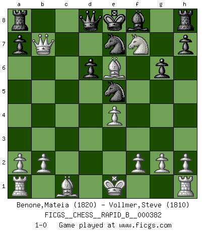 Last move : 1-0 2022 August 7 11:41:57 [Event "FICGS__CHESS__RAPID_B__000382"] [Site "FICGS"] [Date "2022.07.14"] [Round "1"] [White "Benone,Mateia"] [Black "Vollmer,Steve"] [Result "1-0"] [WhiteElo "1820"] [BlackElo "1810"] 1.e4 c5 2.c3 Nc6 3.Nf3 d6 4.d4 cxd4 5.cxd4 e6 6.d5 Nb8 7.Bc4 Ne7 8.Nc3 g6 9.Qa4+ Bd7 10.Nb5 Nc8 11.dxe6 fxe6 12.Bxe6 Bxb5 13.Qxb5+ Nc6 14.Qxb7 N8e7 15.Ng5 Ne5 16.Nf7 1-0 Sicilian : Alapin's variation (2.c3) Player White won this chess game. Follow this game move after move (download)Mistrust is the most necessary characteristic of the Chess player. (Siegbert Tarrasch) Der Umstand, daß uns eine 7 Stunden Zeitkontrolle ermöglicht eine großartige, tiefe Partie zu spielen, ist für die Massenmedien nicht weiter von Bedeutung. (Alexej Shirov) Al jugar al Ajedrez entonces, podemos aprender: Primero: Previsión... Segundo: Prudencia... Tercero: Cautela... Y al final, aprendemos del Ajedrez el hábito de no ser desanimados por apariencias malas presentes en el estado de nuestros asuntos, el hábito de la esperanza por una oportunidad favorable y la perseveración de los secretos de los recursos. (Benjamin Franklin) Le jeu d'échecs est comme rejeté hors du temps. (Antoine de Saint-Exupéry) Plans are ideas that never come to fruition. (Daniel Parmet)