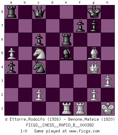 Last move : 1-0 2022 July 22 15:13:27 [Event "FICGS__CHESS__RAPID_B__000382"] [Site "FICGS"] [Date "2022.07.14"] [Round "1"] [White "d Ettorre,Rodolfo"] [Black "Benone,Mateia"] [Result "1-0"] [WhiteElo "1926"] [BlackElo "1820"] 1.e4 e5 2.Nf3 Nf6 3.Nc3 Nc6 4.Bb5 Bc5 5.O-O O-O 6.Nxe5 Nxe5 7.d4 Bd6 8.dxe5 Bxe5 9.Bd3 c6 10.f4 Bd4+ 11.Kh1 d6 12.Bd2 Re8 13.Qf3 Bg4 14.Qg3 b5 15.h3 Bh5 16.Rae1 Nd7 17.b4 Nb6 18.e5 dxe5 19.fxe5 Nc4 20.Bg5 Qd7 21.Bf5 Qc7 22.Ne4 Bxe5 23.Bxh7+ Kxh7 24.Qh4 Kg8 25.Qxh5 Re6 26.Nc5 Rd6 27.Ne4 Re6 28.Qg4 Qc8 29.a4 a5 30.bxa5 bxa4 31.Nc5 1-0 Petrov Three knights game Kingside Castling by player White (move 5) Kingside Castling by player Black (move 5) Player White won this chess game. Follow this game move after move (download)For me, Chess is life and every game is like a new life. Every Chess player gets to live many lives in one lifetime. (Eduard Gufeld) Ich verstehe Aljechins Kombinationen ganz gut; aber woher er diese Angriffschancen bekommt und wie er die Eröffnung behandelt das ist für mich ein Buch mit sieben Siegeln. (Rudolf Spielmann) Yo considero que Fischer es uno de los expertos mas grandes de aperturas de siempre. (Keith Hayward) Demandez au pauvre Cg1 ce qu'il en pense. Eduard Gufeld à propos de la variante Saemisch de l'Est-Indienne. Life is verb, not a noun. (Charlotte Perkins Gilman)