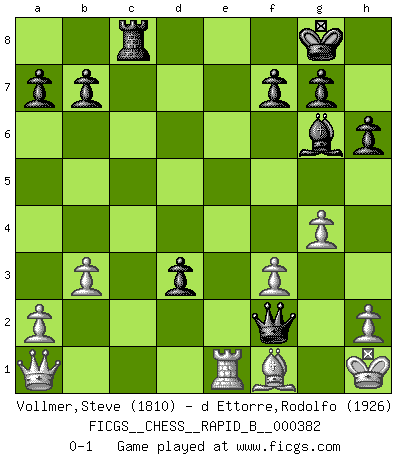 Last move : 0-1 2022 September 11 10:10:24 [Event "FICGS__CHESS__RAPID_B__000382"] [Site "FICGS"] [Date "2022.07.14"] [Round "1"] [White "Vollmer,Steve"] [Black "d Ettorre,Rodolfo"] [Result "0-1"] [WhiteElo "1810"] [BlackElo "1926"] 1.c4 e6 2.Nf3 Nf6 3.g3 d5 4.cxd5 exd5 5.d4 Bd6 6.Bg2 c6 7.Nc3 O-O 8.O-O Re8 9.Qc2 Nbd7 10.e4 Nxe4 11.Nxe4 dxe4 12.Ng5 Nf6 13.Nxe4 Be7 14.Rd1 Bg4 15.f3 Bh5 16.Nxf6+ Bxf6 17.Qc3 c5 18.Be3 Rxe3 19.Qxe3 Bxd4 20.Rxd4 cxd4 21.Qf4 Qb6 22.b3 d3 23.Kh1 Qf2 24.g4 Bg6 25.Qe5 Qc2 26.Re1 h6 27.Qa1 Rc8 28.Bf1 Qf2 0-1 English Opening Kingside Castling by player Black (move 7) Kingside Castling by player White (move 8) Player Black won this chess game. Follow this game move after move (download)I don't believe in psychology. I believe in good moves. (Bobby Fischer) Glücklicherweise sind Großmeister Ruben Fines reine Schachbücher weniger phallozentrisch [als seine Schachpsychologie] und deswegen auch weniger lächerlich. (Nigel Short) El Ajedrez, como cualquier actividad creativa, solo puede existir a través del esfuerzo combinado de aquellos que tienen talento creativo y de aquellos que poseen la habilidad de organizar su trabajo creativo. (Mikhail Botvinnik) Seul un grand joueur sait à quel point il joue faiblement. (Xavier Tartacover) Never risk one's whole fortune unless supported by one's entire army. (Niccolo Machiavelli)